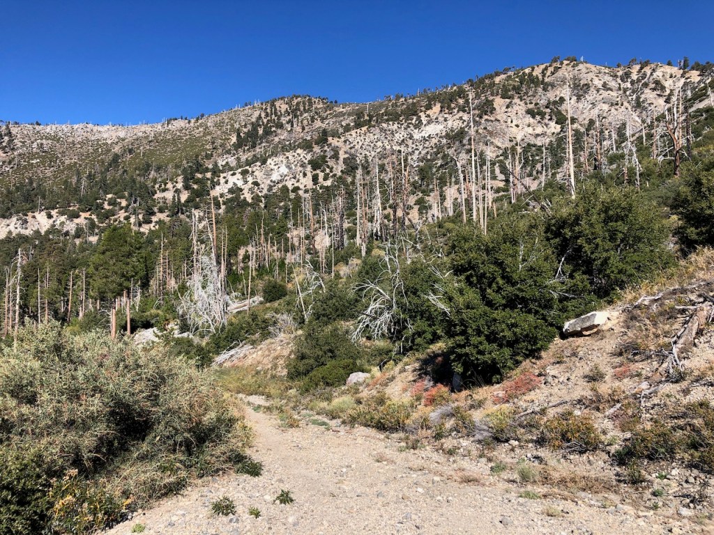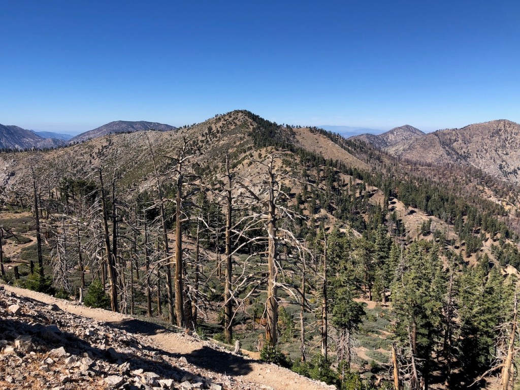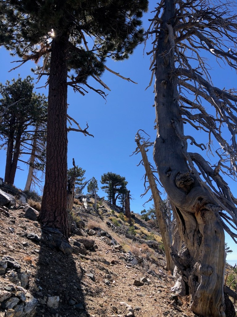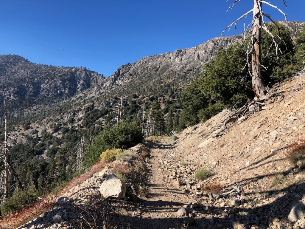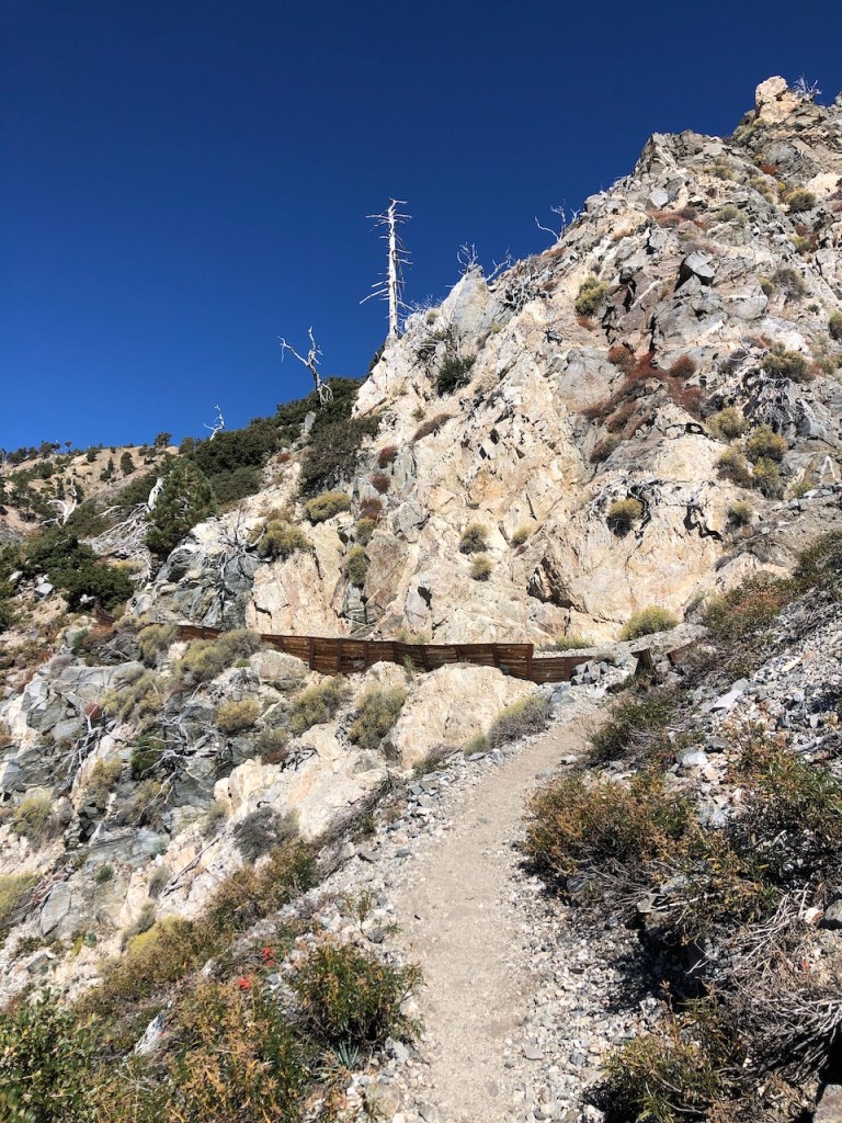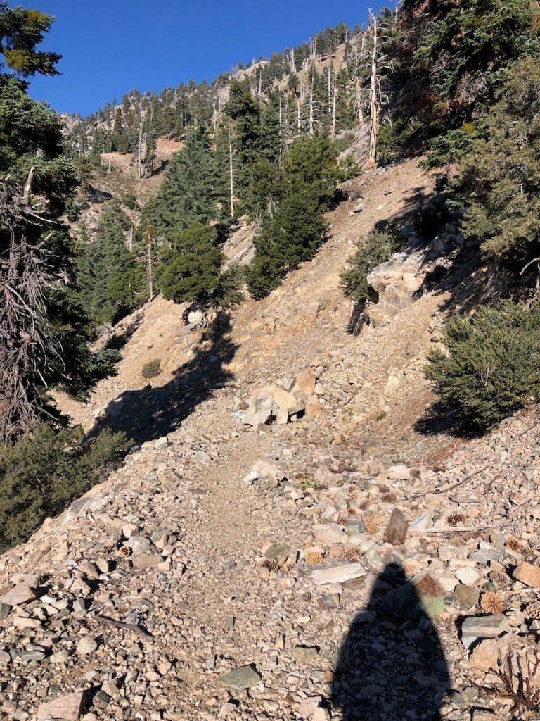 The steep switchbacks kept on climbing higher. There were a handful of standing deadfall trees, and not much shade along the way. At one point the trail had narrowed to less than three feet wide.
