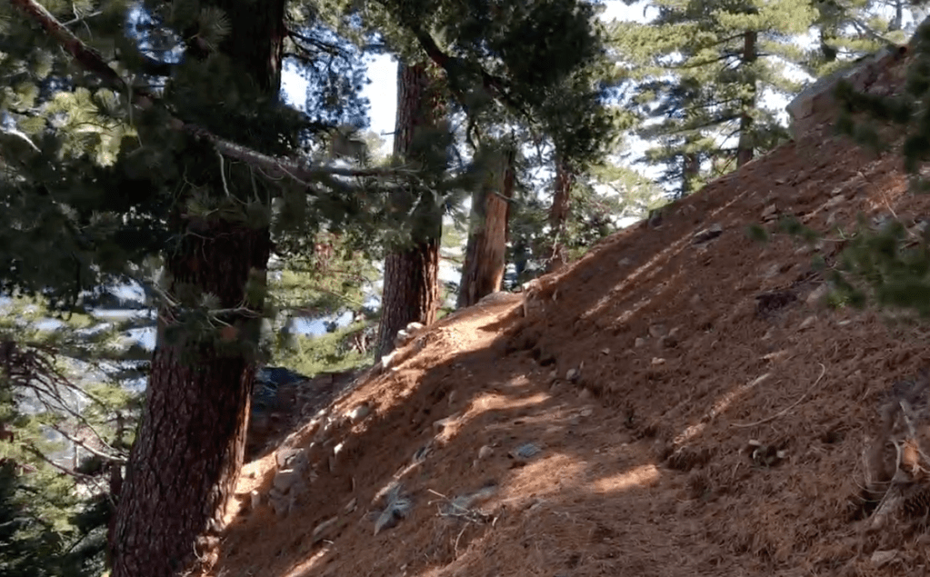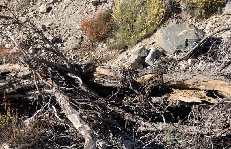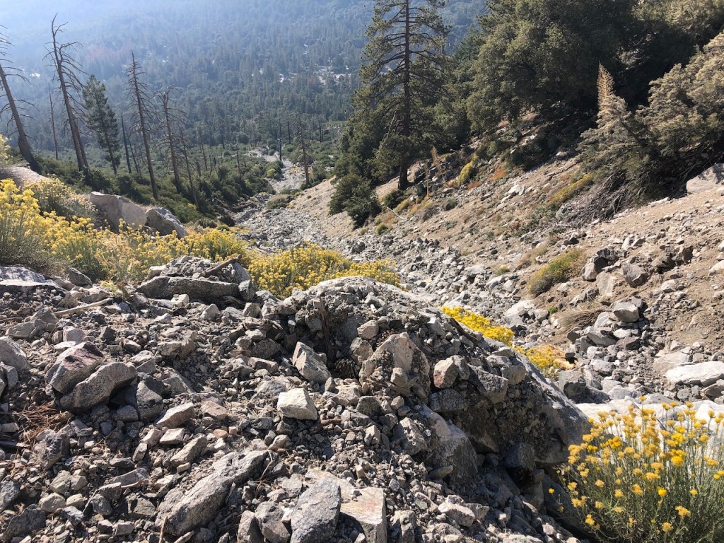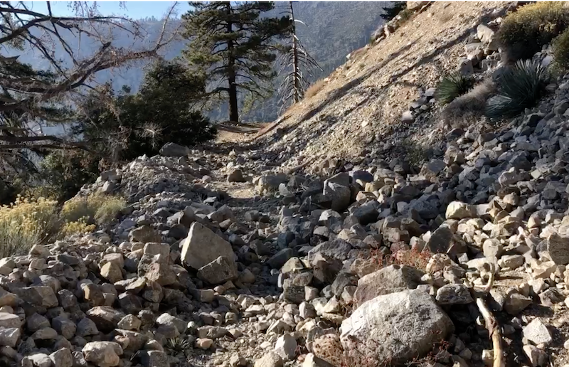 After making a right onto the trail toward Mount Hawkins I noticed almost immediately that the trail had some damage. As I crossed a wash, and a big gully created by a previous rockfall, I encountered several large downed trees. They were tossed here and there like matchsticks. I maneuvered around the obstacles before me, and returned to the trail.