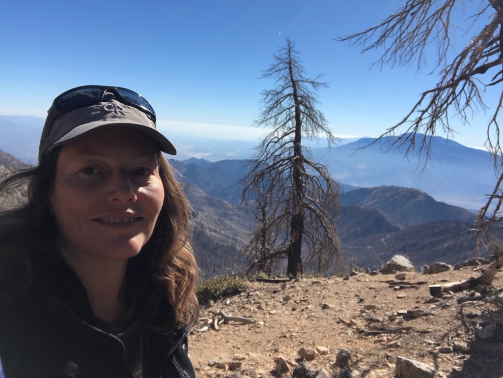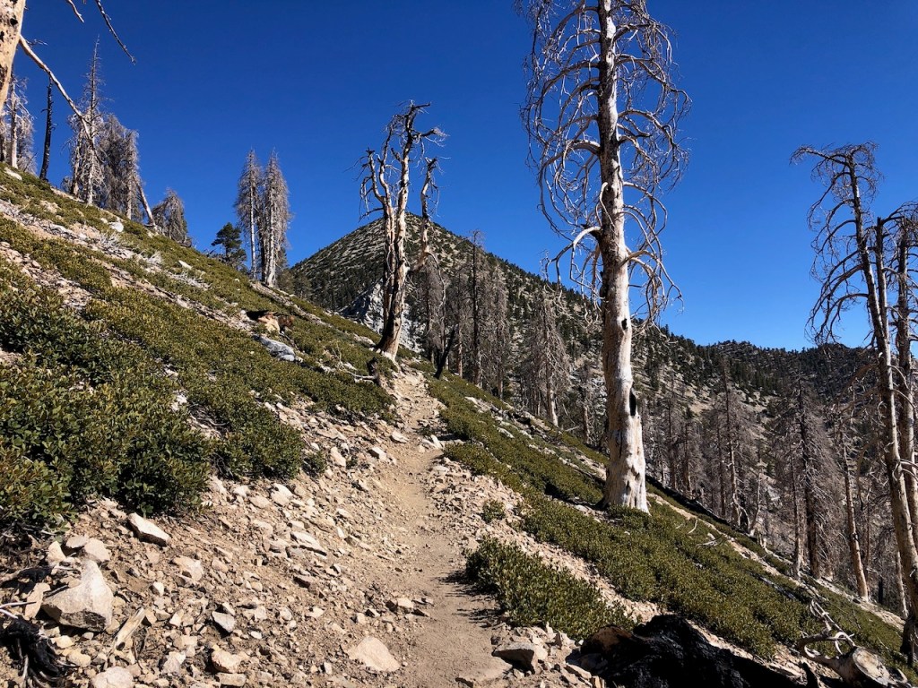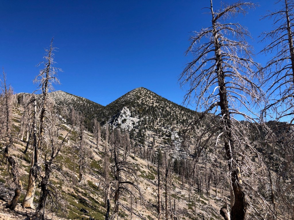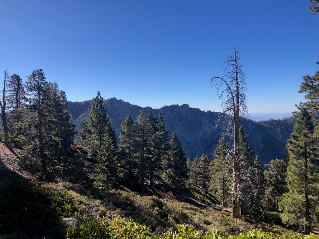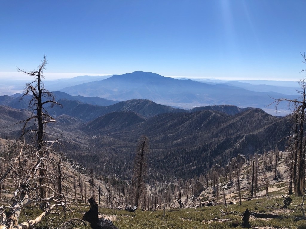 I gazed out over a moonscape, a huge swath of standing deadfall trees, with Mount San Jacinto in the distance. This area had recently burned, and the trees stood like skeletons.