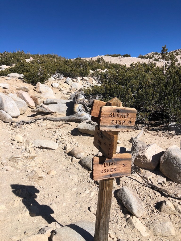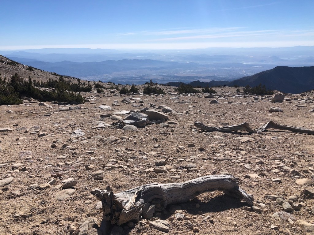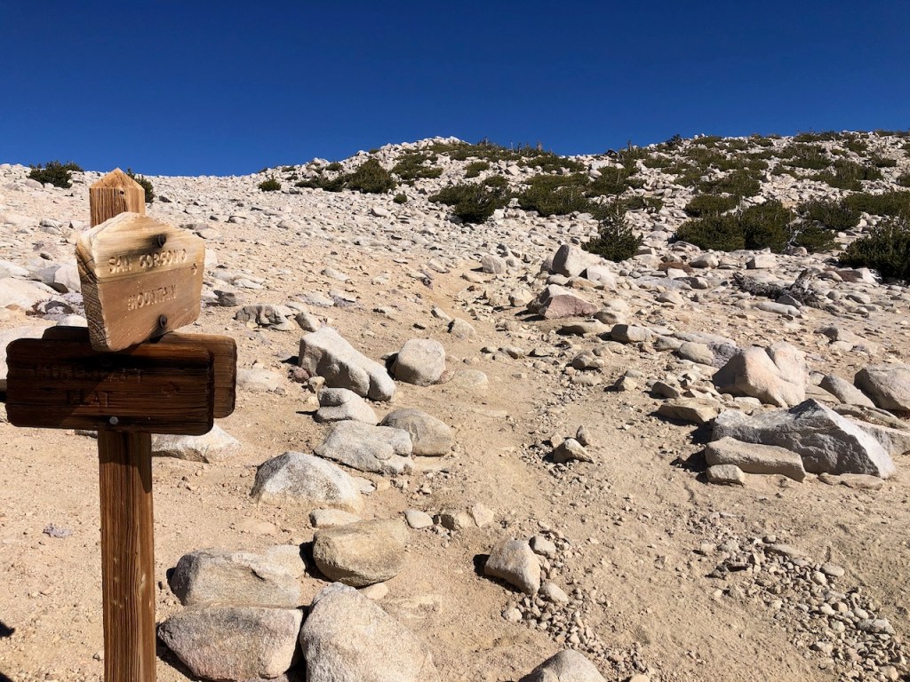 It was almost 1pm, when I finally reached the turnoff for Mount San Gorgonio. I was now less than a mile from the peak. I ditched my pack in a bush, and marked where it was with a cairn, and a makeshift arrow. That’s how tired I was. I just needed to get there at this point. People ditch packs for the last mile to Mount Whitney, so it was reasonable. It was a 15 lb pack with 3 liters of water left of the 5.5 liters I started with. With a lighter pack, I would have been there much sooner.