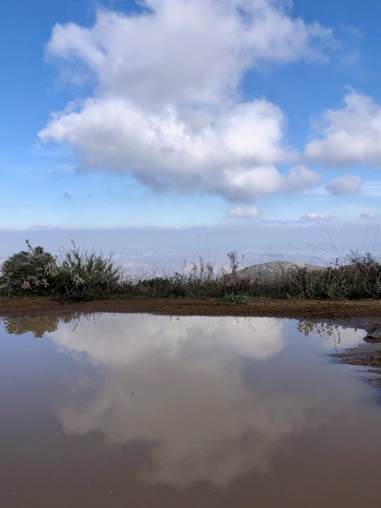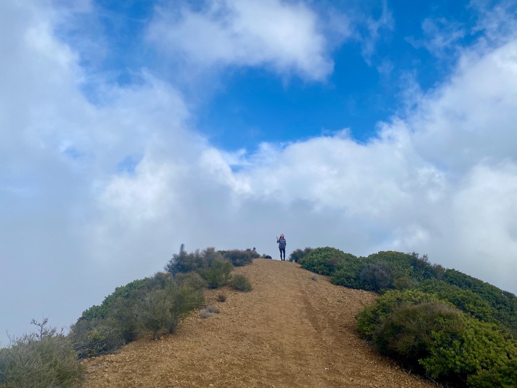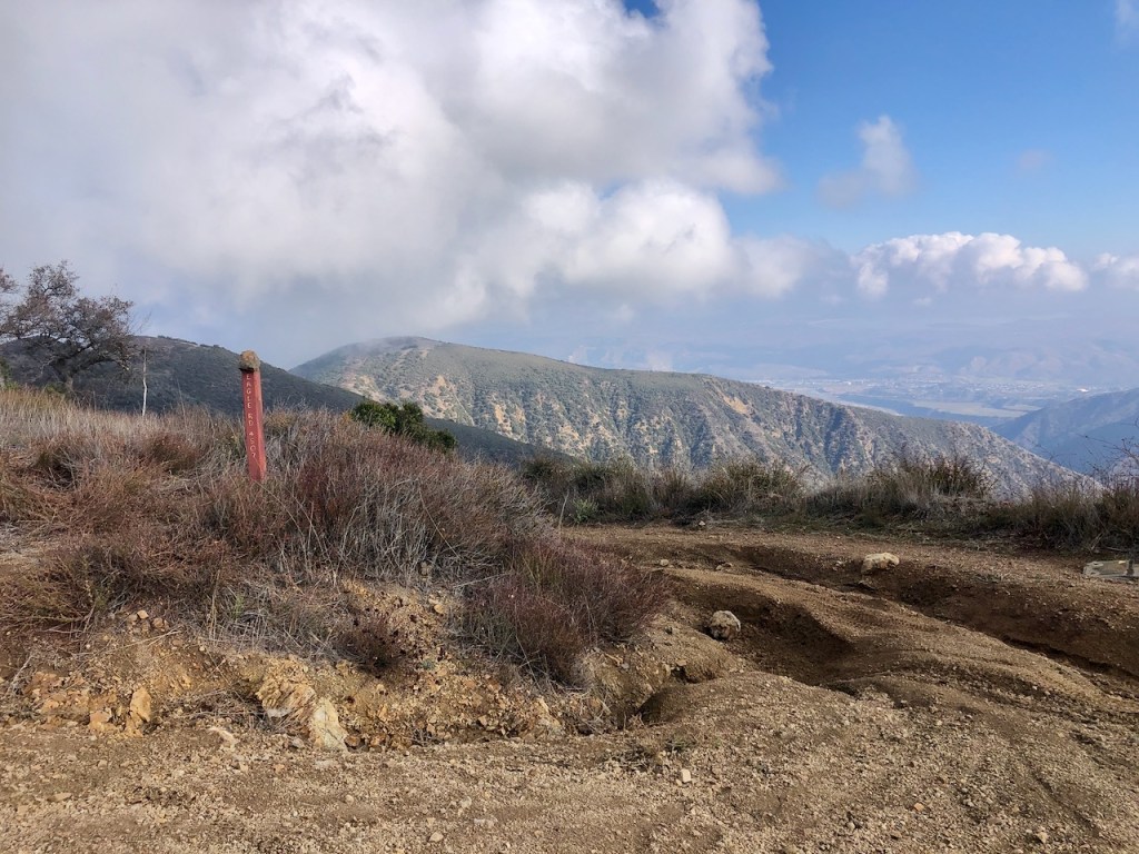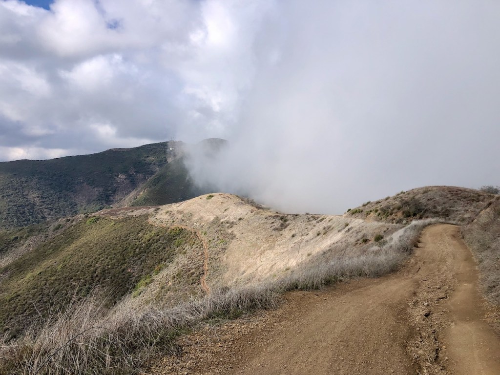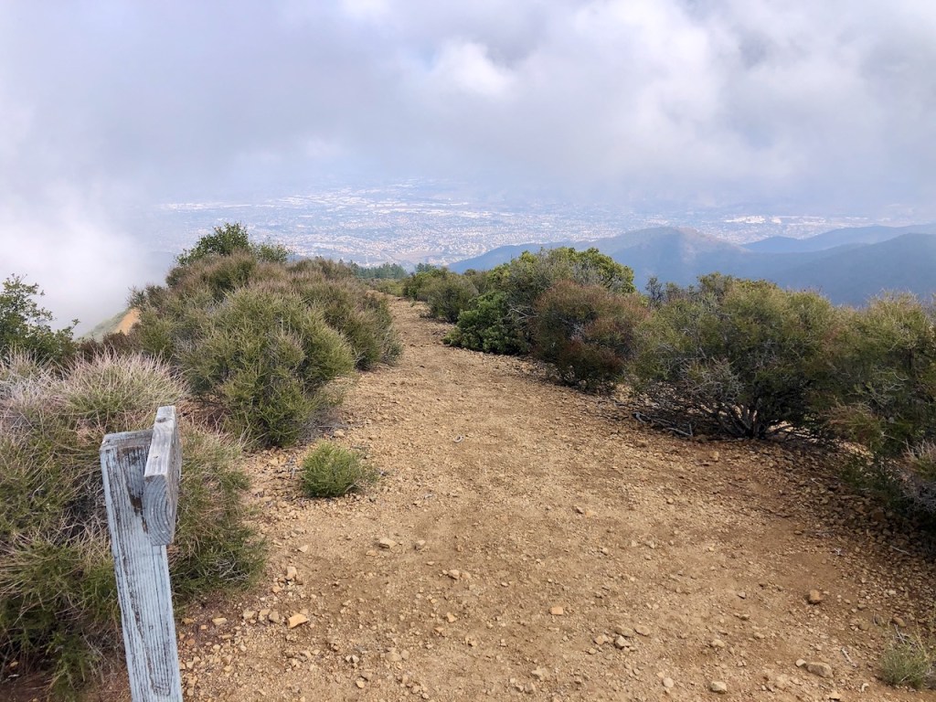 The vastness of the Inland Empire, of Riverside, Corona, and Lake Elsinore, was to my right. It was a beautiful scene, with the clouds still hanging low. I could only see a small glimpse of Lake Elsinore, though views of Mount San Jacinto were completely obscured. As we hiked on I could see Pleasants Peak in the distance. It would be a 5 mile hike from that turnoff to the peak. The low clouds began to threaten to engulf us, and I wondered how long the sun would last. Would there even be a view from the peak?