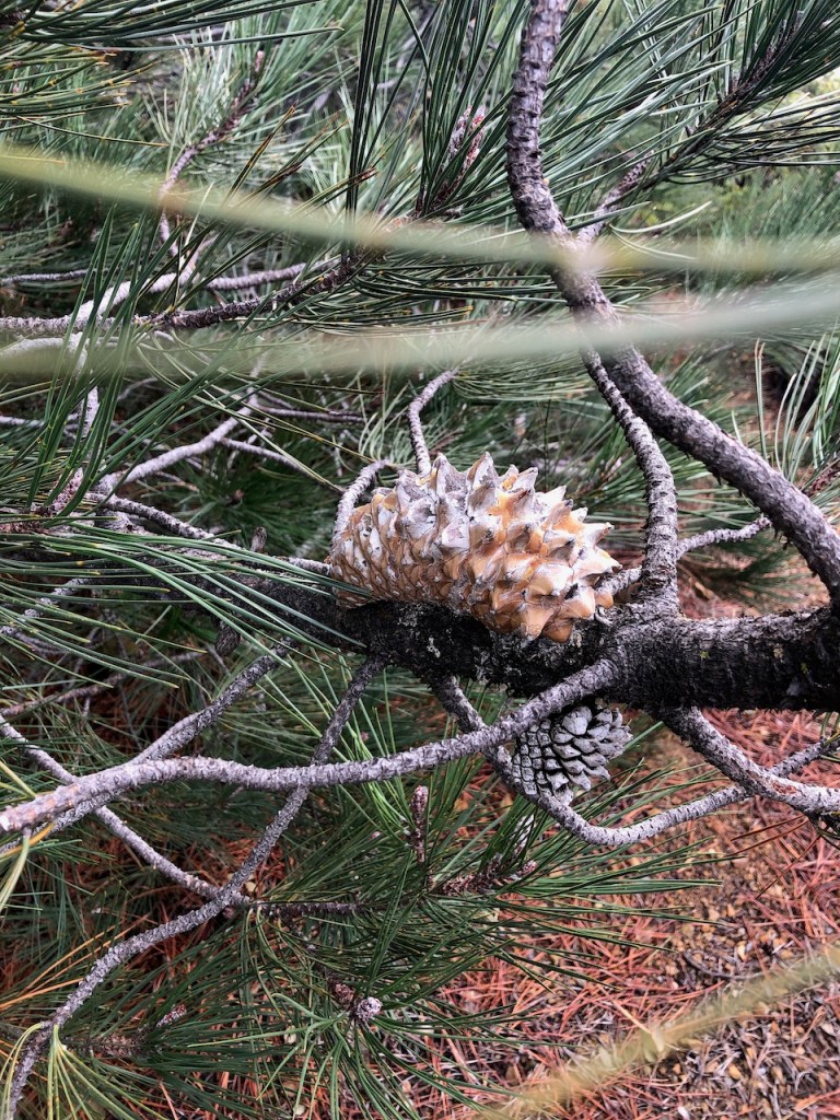 I was slightly concerned about time, and that we might make it back just before dark. We stopped on the way down the ridge to marvel at nature, and the cones of the strange knobcone pine tree.