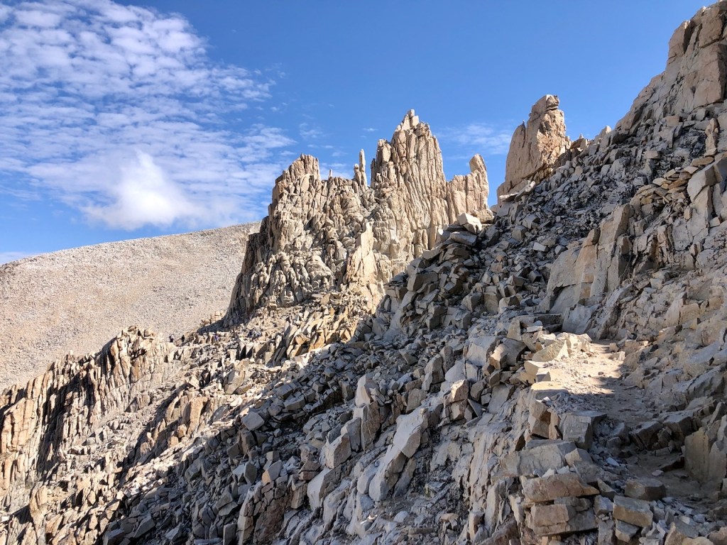In the distance, I began to see some jagged rocky spires jutting out to the right, which loosely resembled those on Mount Whitney.