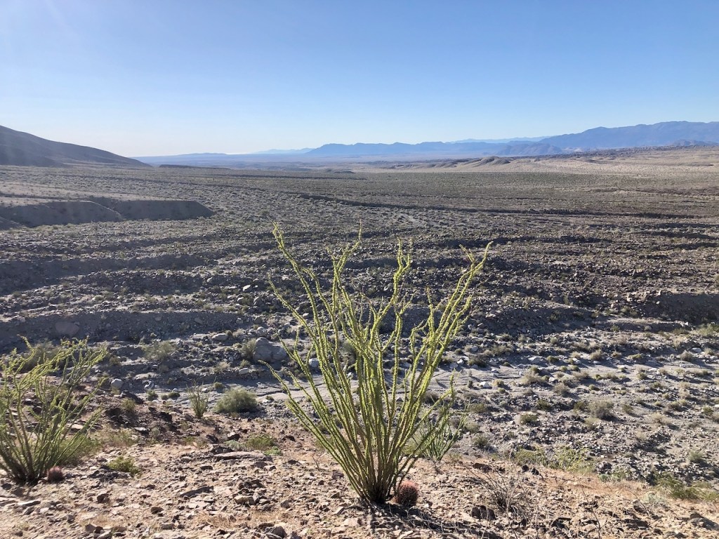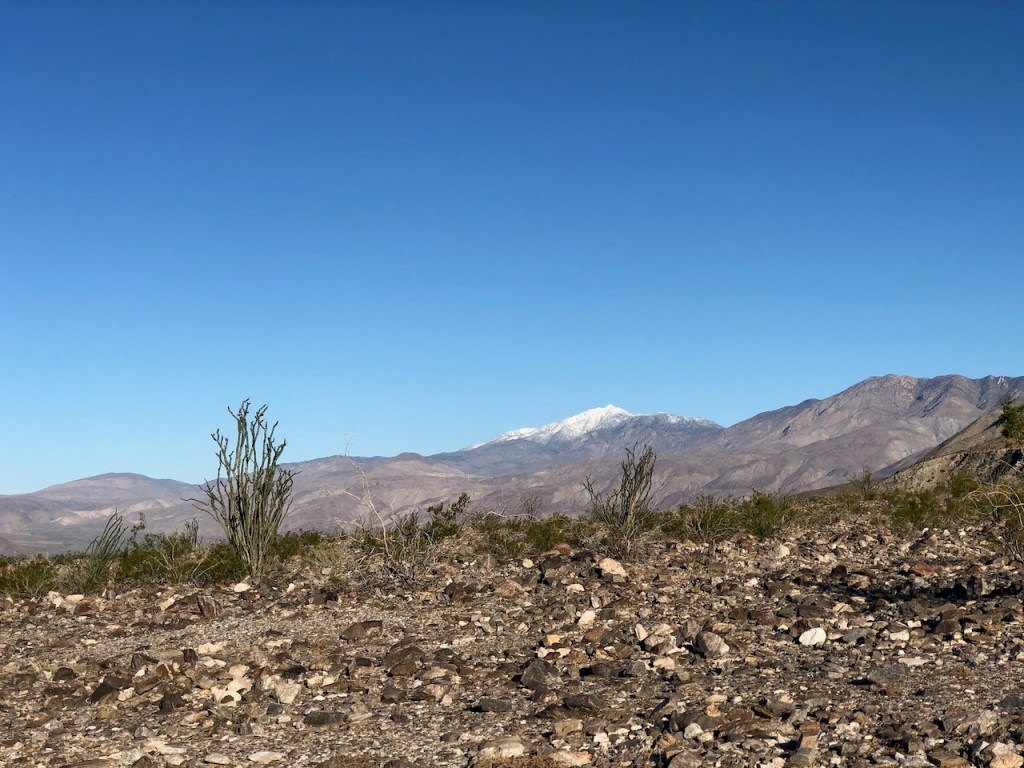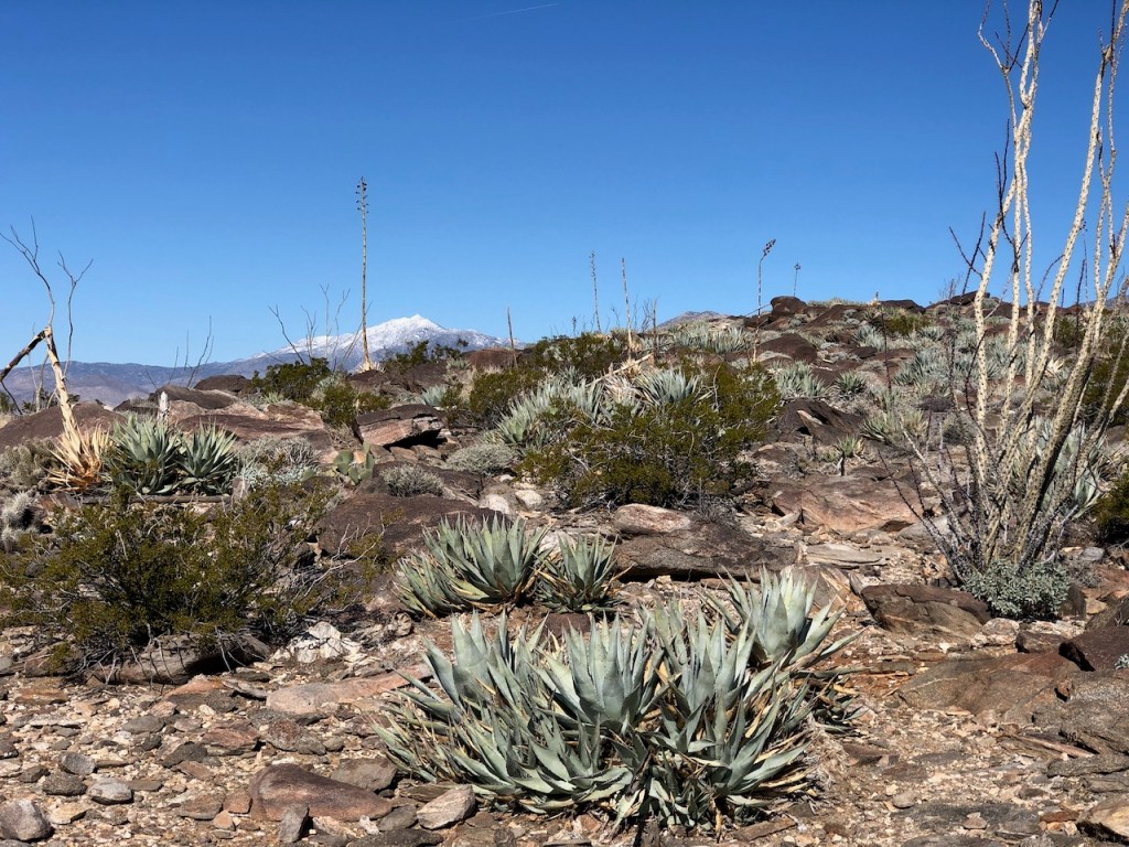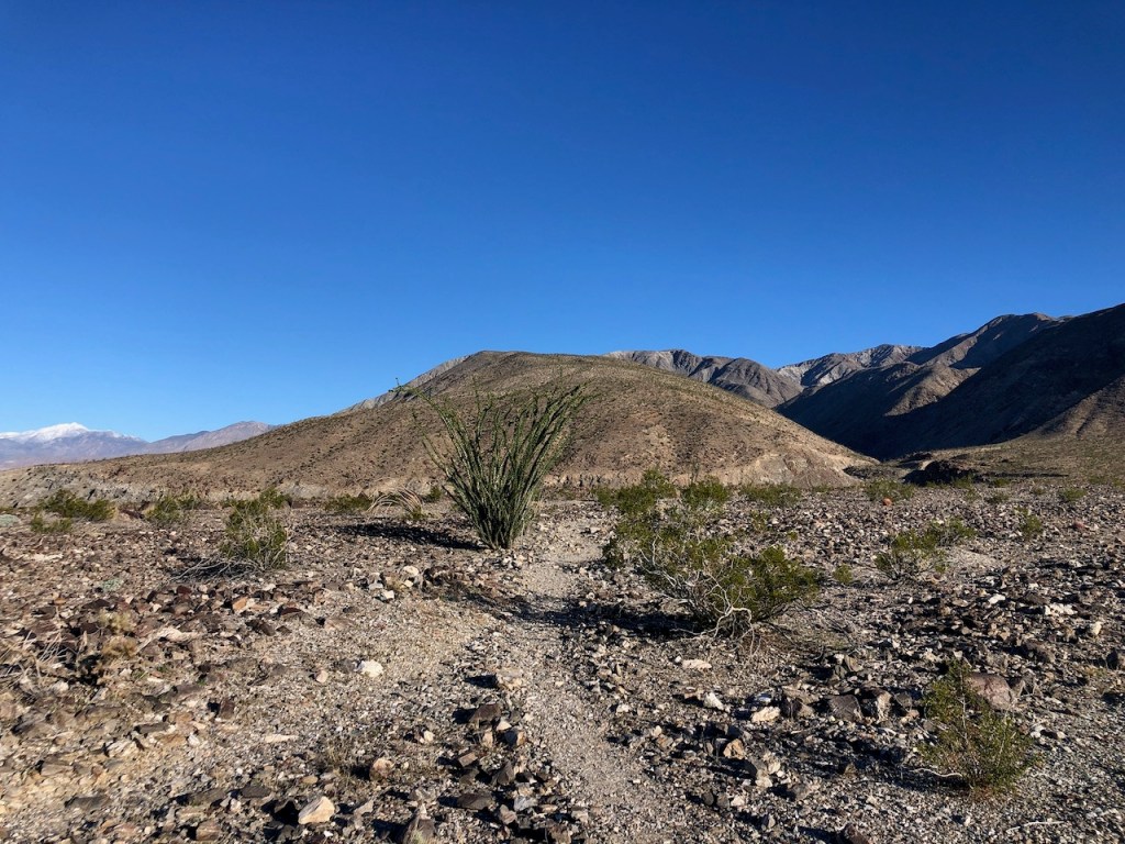 As I trekked off through the desert gardens, of low-growing shrubs, thorn bushes, cacti, and spiny ocotillo, I gazed north along the path. I spotted a few snow-capped high peaks in the distance. I loosely envisioned climbing one of these peaks someday when they are covered in snow, but who knows when that will be?