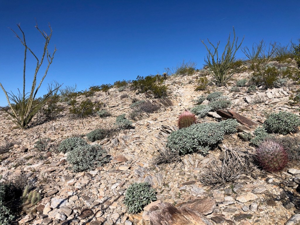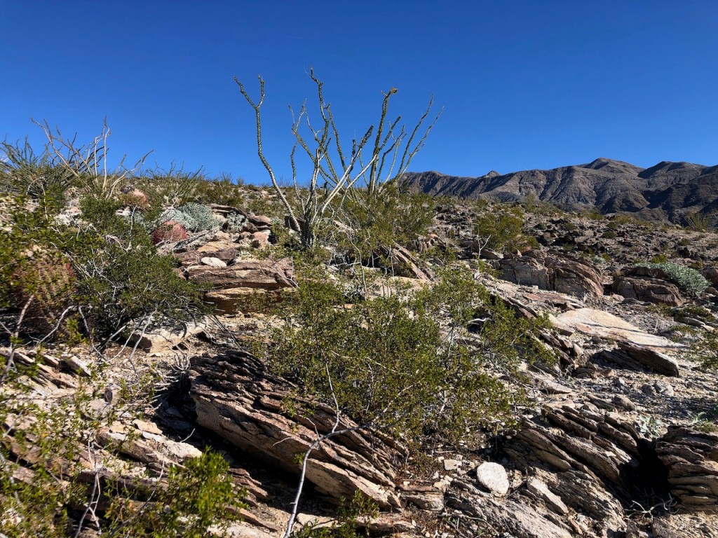 I sat there on this rock for about 10-15 minutes, surrounded by a beautiful rock garden of ocotillo, cholla, and barrel cactus. This landscape would not change for much of the hike. When I felt sufficiently rested, I continued onward, knowing consistent effort was the key to making it there.