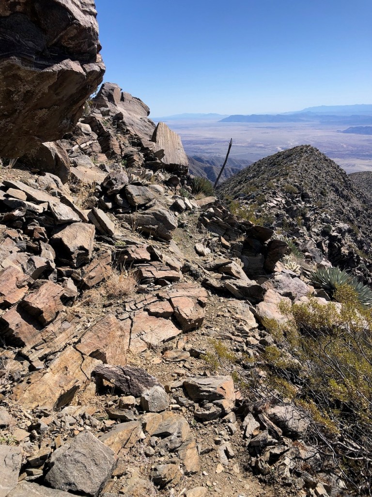 This is one trail, I would not recommend doing solo, as I did. There were too many opportunities to be injured, or fall off into the abyss, be sliced by yucca, or crushed by rocks. This is a hike, that will take twice as long as all the others you have done. Villager Peak, like most of the desert peaks, could be considered to be more challenging, than the trail up to like Mount Whitney.