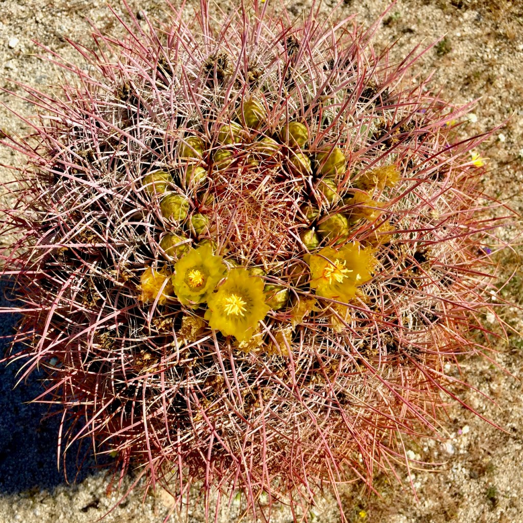 I was greeted with humongous barrel cactuses, standing tall with their vibrant red spines. The scene was a mix of boulders, chola, and low-growing shrubs, with desolate-looking pyramidal desert peaks all around.