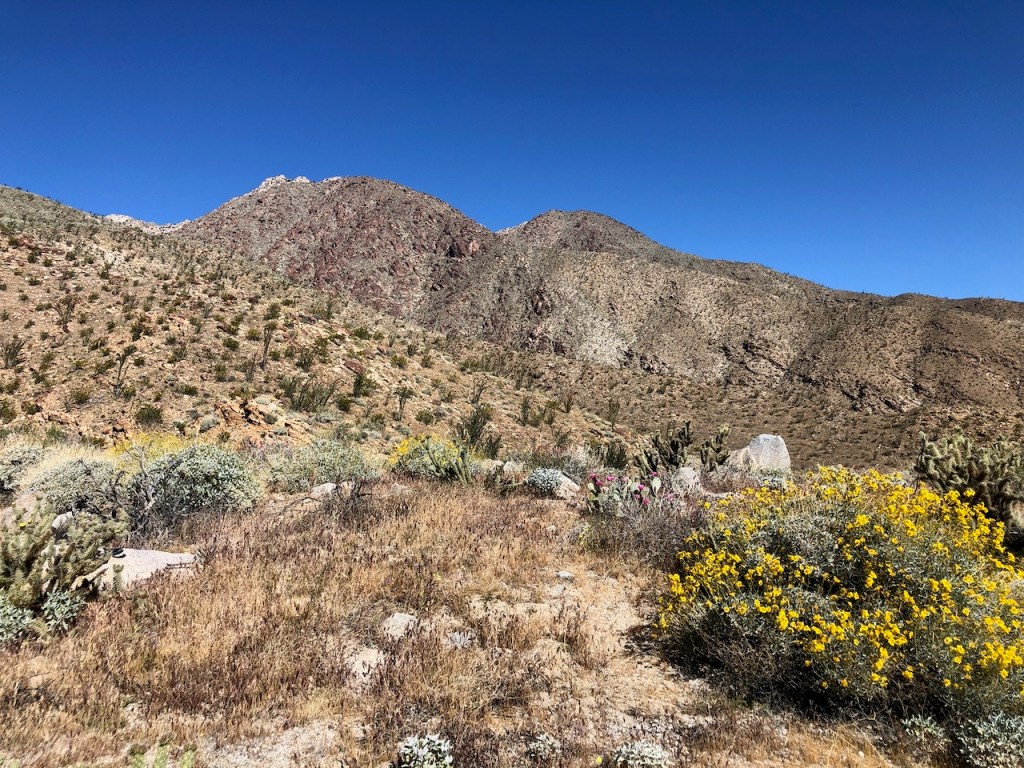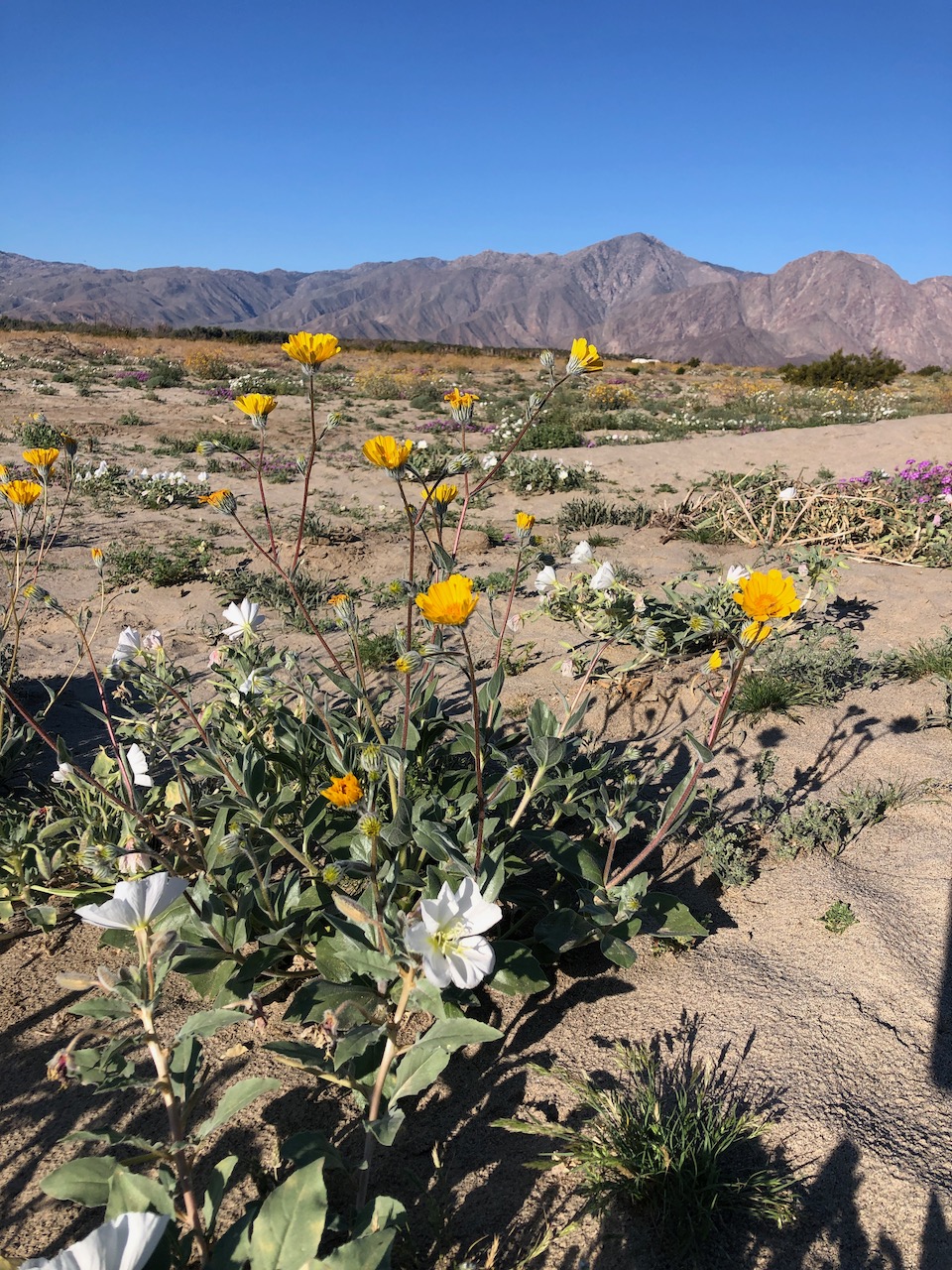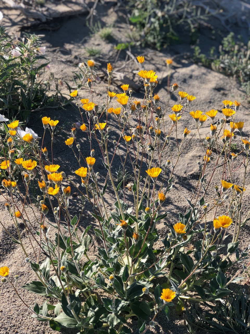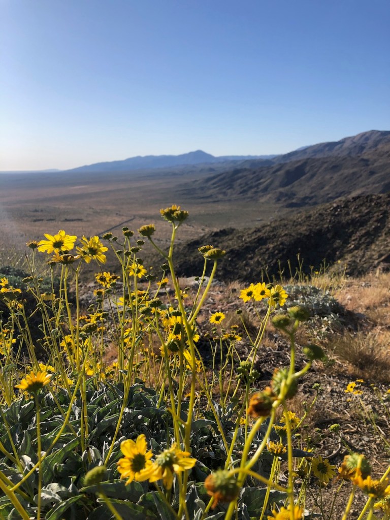 I stopped at the overlook to gaze out over the valley, greeted by some bush sunflowers. I knew the desert was in bloom, but to what extent, was a mystery. My last trip here was in February, and not even the cactus had bloomed at that point.
