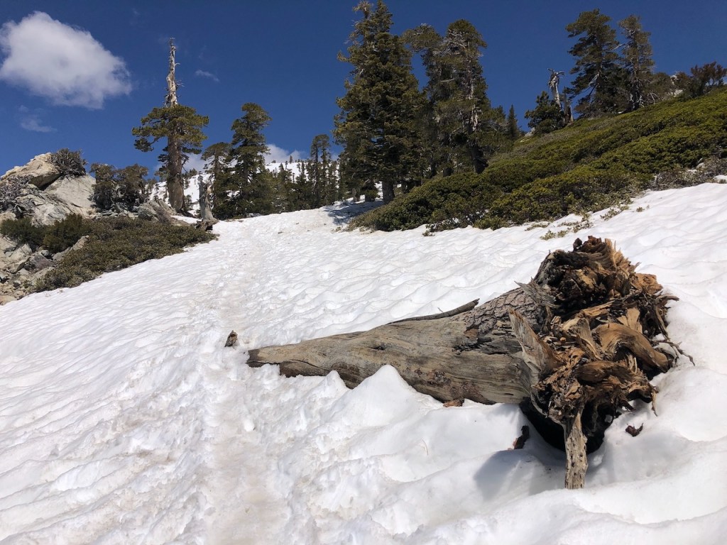 As I hiked on, the trail seemed to get lost. I knew I was hiking amongst the brambles and boulders, but they were covered. The trail became increasingly steep, and the suncups ever deeper.