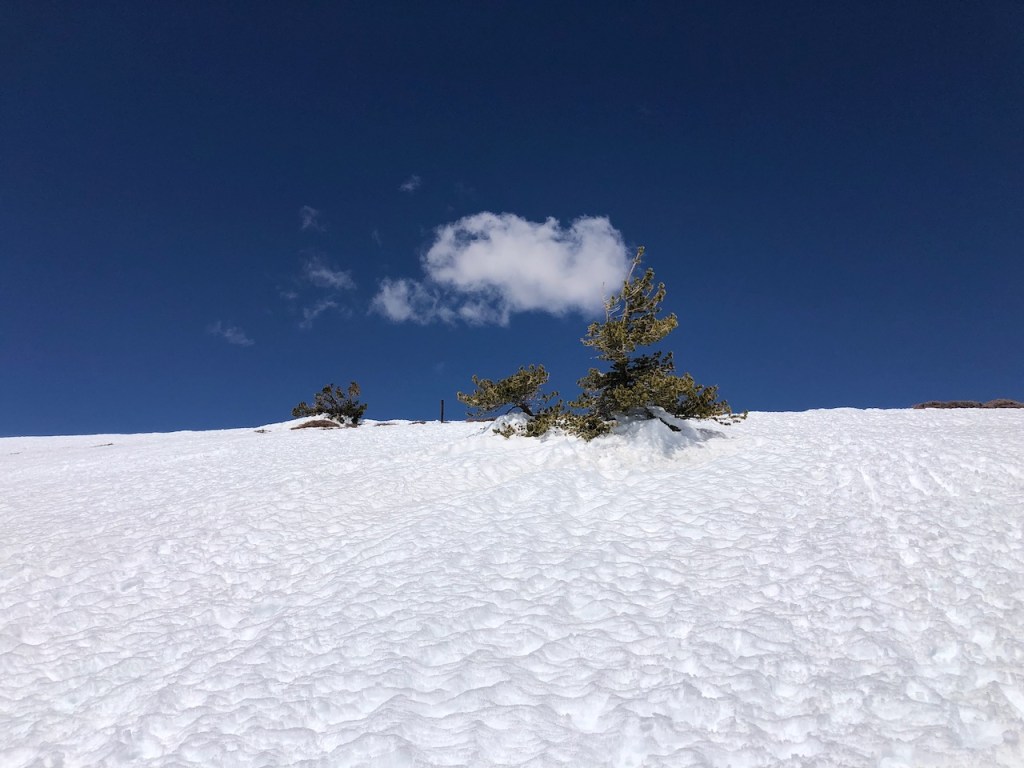 I soon reached knee-deep snow, which had changed into suncups, a phenomenon caused by snowmelt. They make traveling in snow more arduous since you have to step up and over them. The deeper they become the tougher it is.
