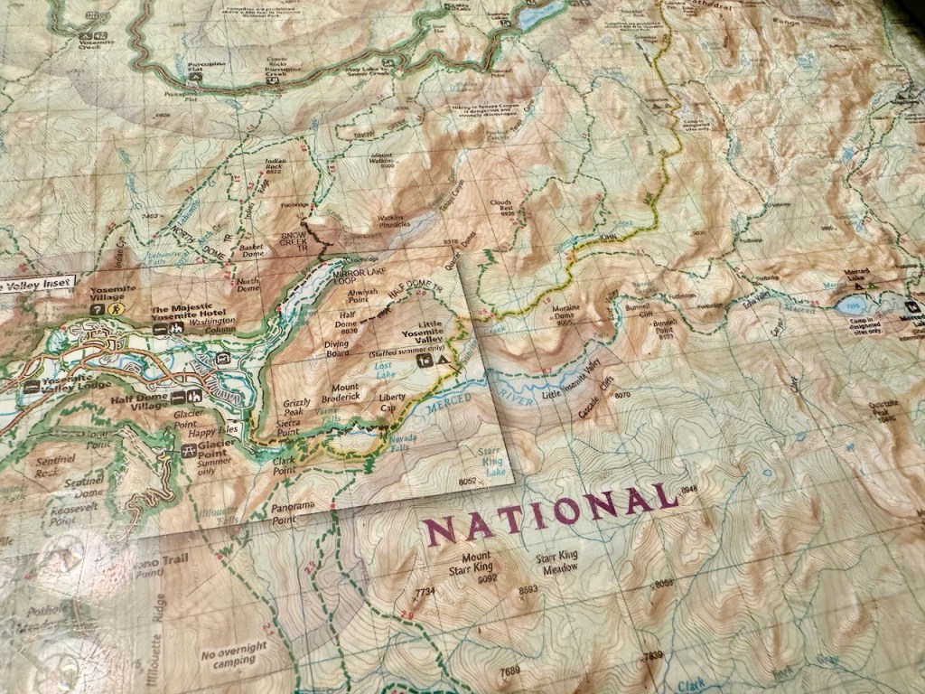 Upon checking in and picking up my permit for Half Dome earlier in the day, the ranger had made a big point about where I could camp and where I could not. The shaded purple areas on her map in the office were off-limits. According to rangers I had spoken to on the phone on previous occasions, I was allowed to camp one air mile from any trailhead, with a few exceptions, in areas that were off-limits. I knew I could not camp near Glacier Point or Bridalveil Creek. Aside from that, I had to squint at the photo on my phone of the map from the wilderness permit office. Why were these off-limits areas not marked on the map handed to me? Did it even matter?