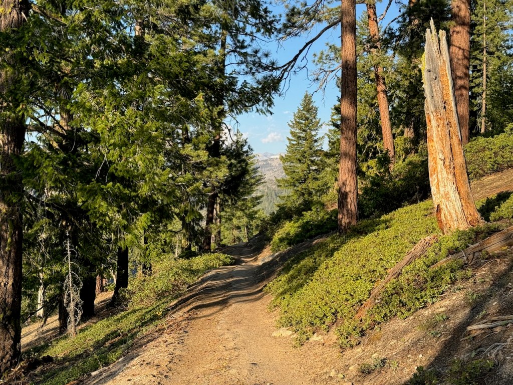 There was dense vegetation along the hillsides, which was lush and green characteristic of springtime in the Sierra. Right away I began to hear the sounds of redtail hawks, various songbirds, and the distinctive call of the Sooty Grouse. I would soon pass a mother Grouse, and her baby chick along the trail. They were unafraid of me, something I noticed before in Yosemite, that wildlife will come close to you, perhaps because they are protected here, so they don’t fear people.