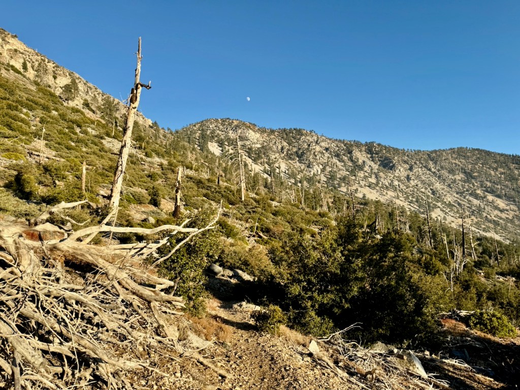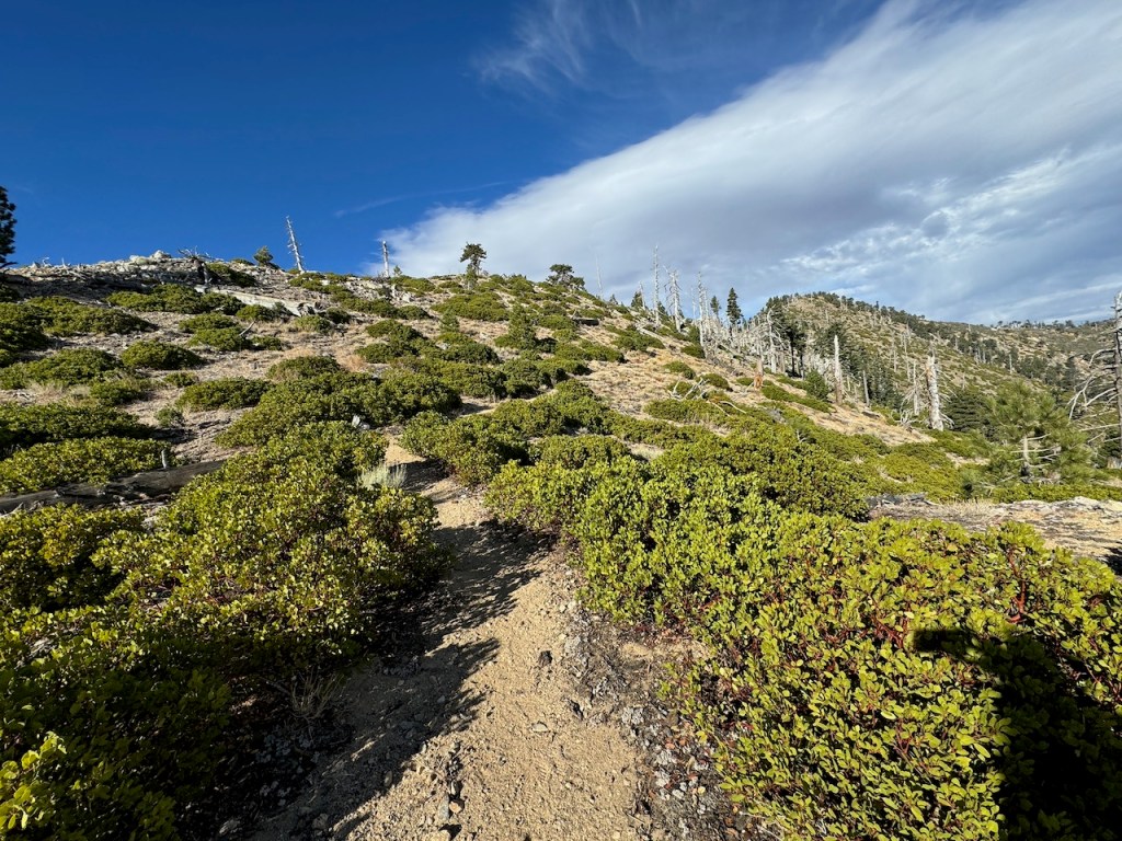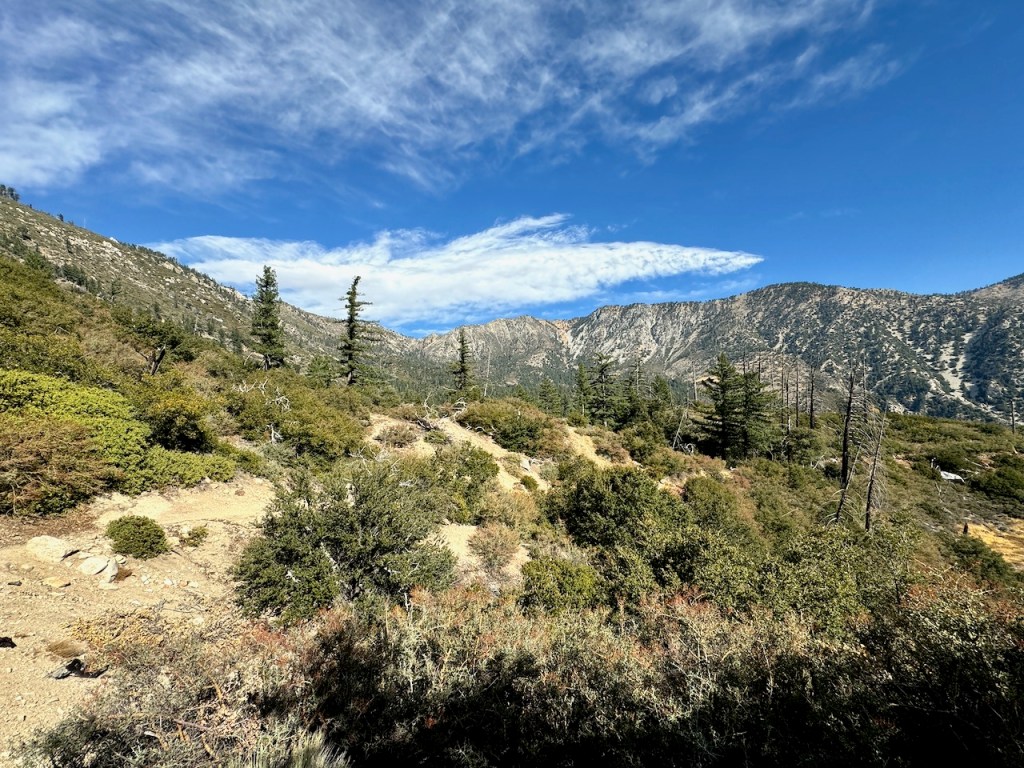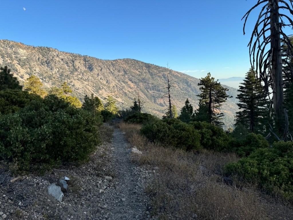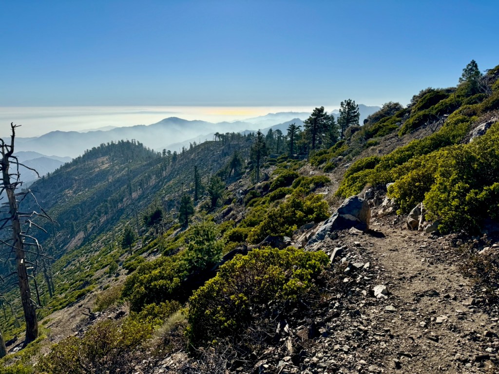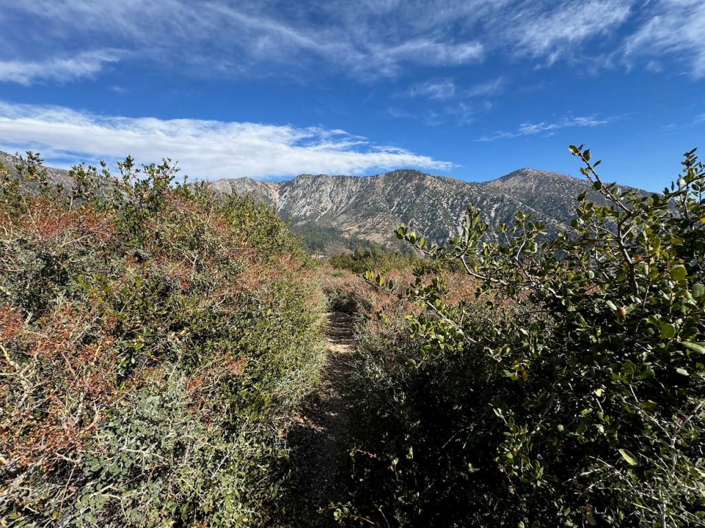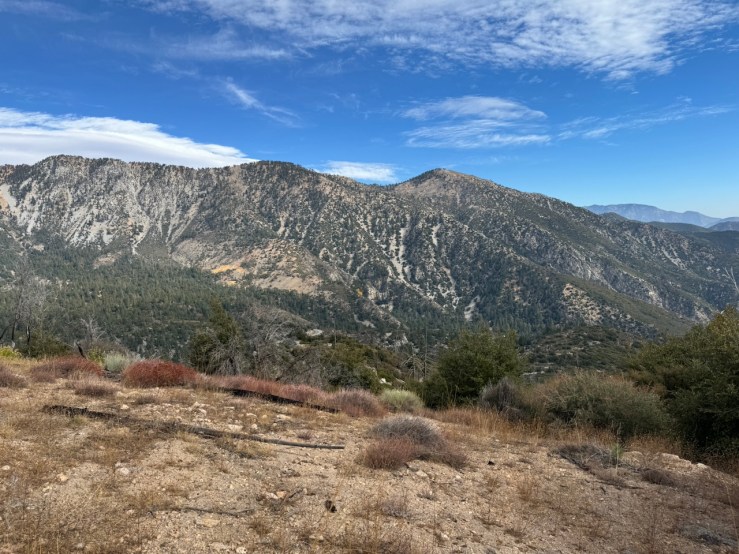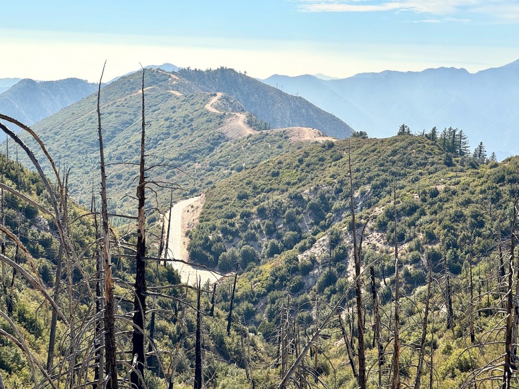 It was mostly exposed to the sun, and there were clear views of the opposite ridge of Middle, Sadie, and South Mount Hawkins. The ridge had a red tinge, from fire retardant, to hold back the Bridge fire, which charred the area east of Crystal Lake, raging for well over a month, growing to over 56,030 acres before containment.