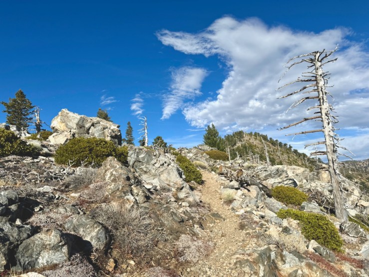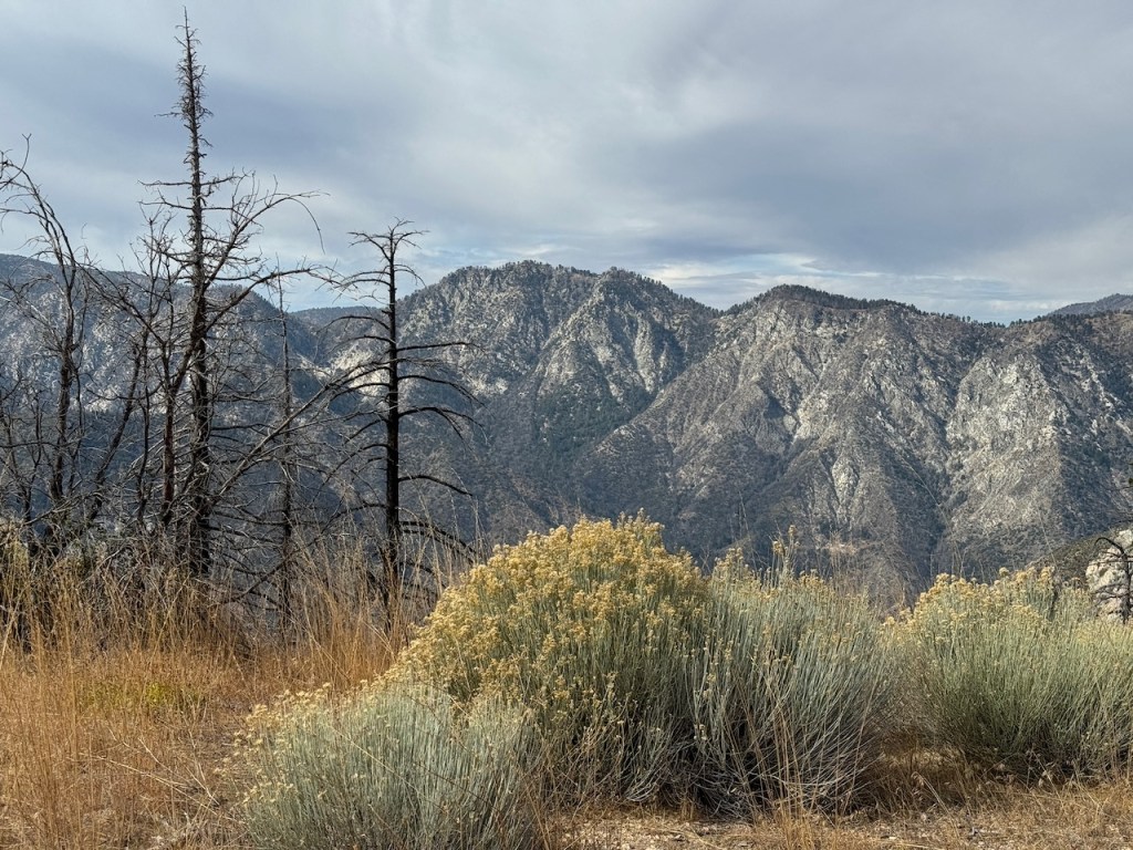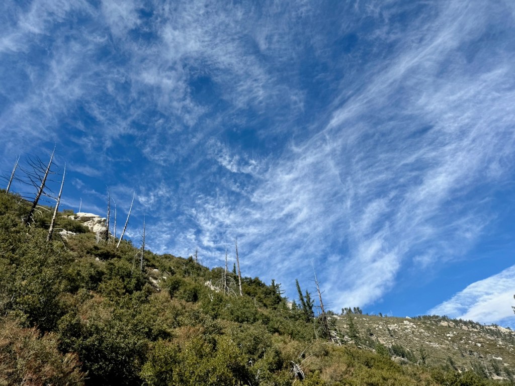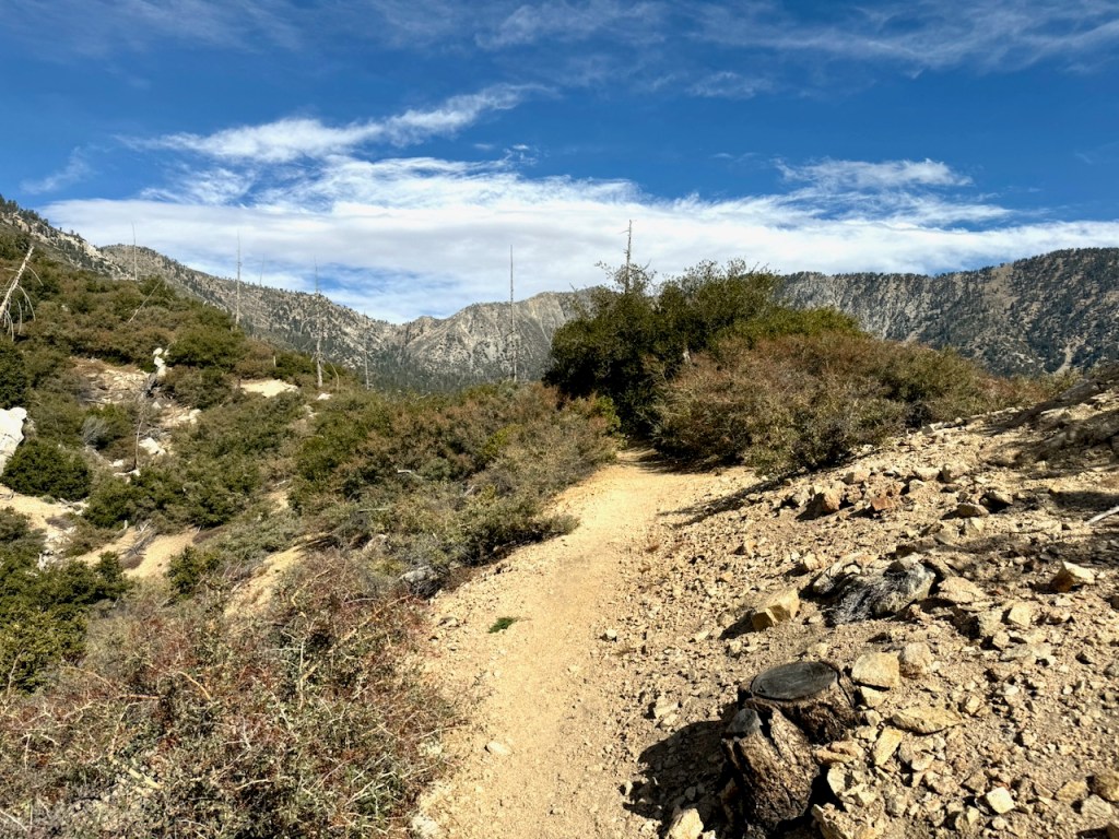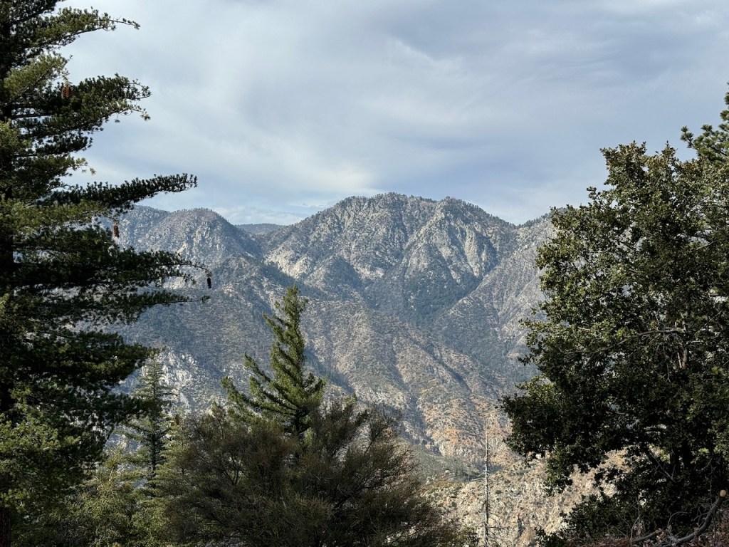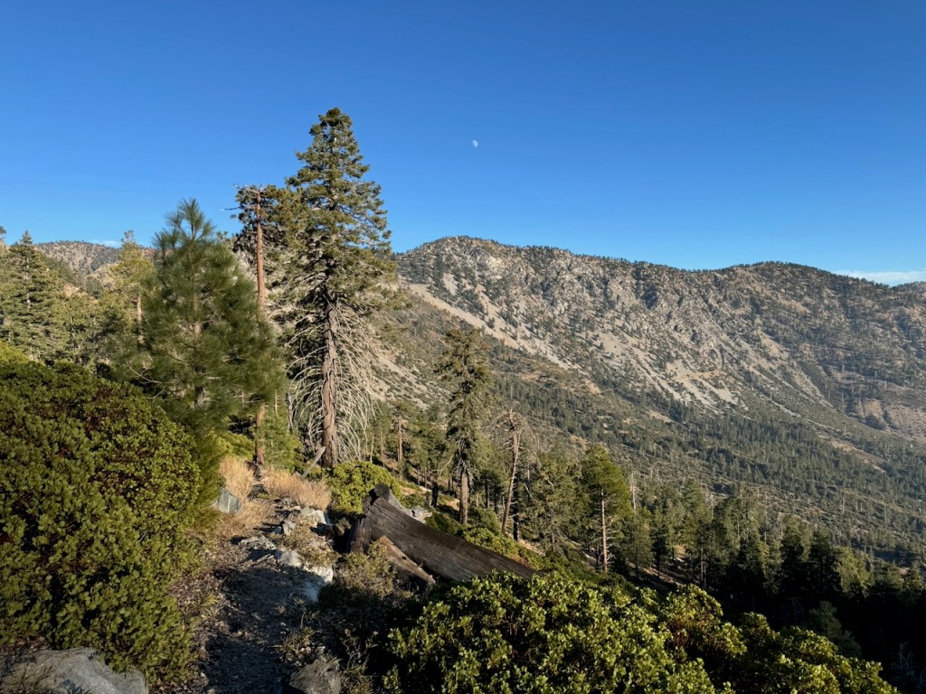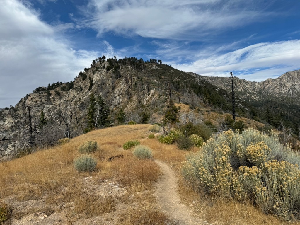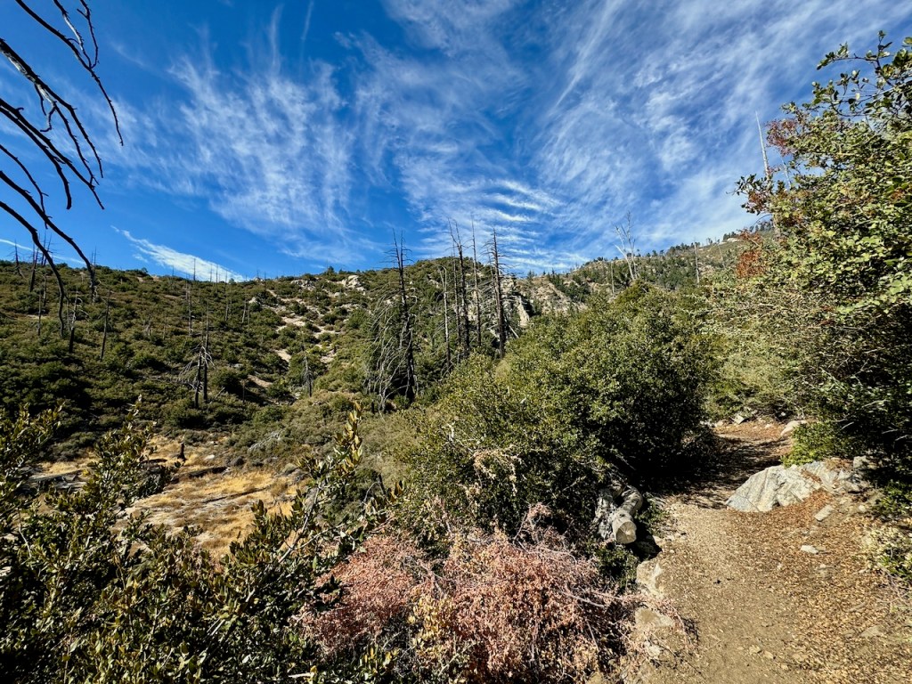 It was mostly exposed to the sun, and there were clear views of the opposite ridge of Middle, Sadie, and South Mount Hawkins. The ridge had a red tinge, from fire retardant, to hold back the Bridge fire, which charred the area east of Crystal Lake, raging for well over a month, growing to over 56,030 acres before containment.