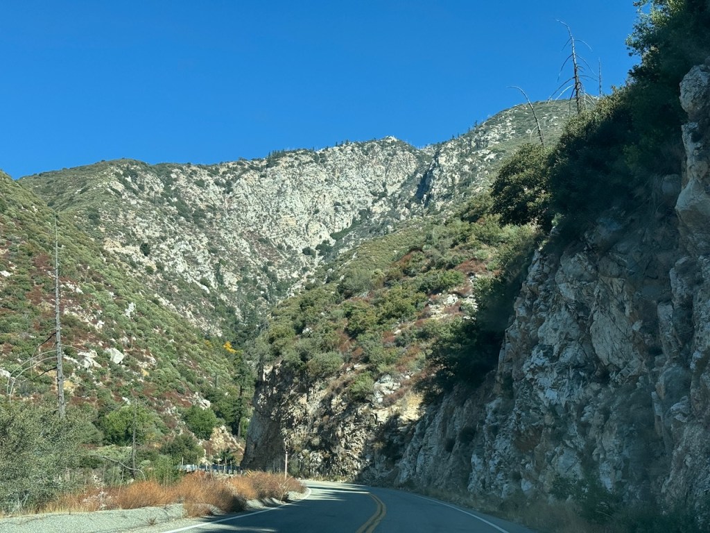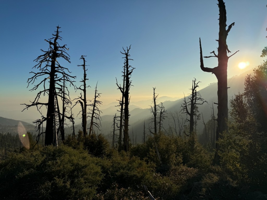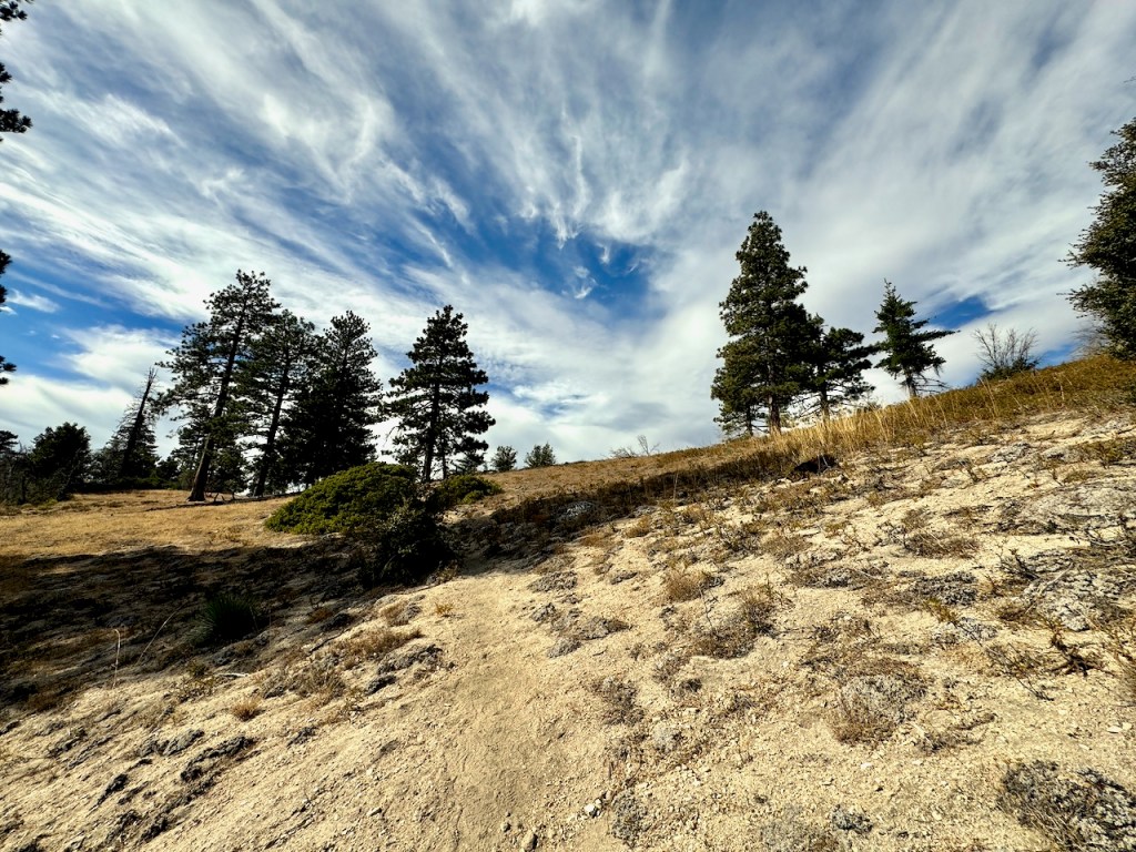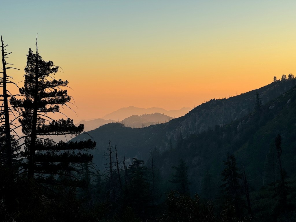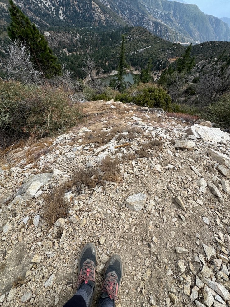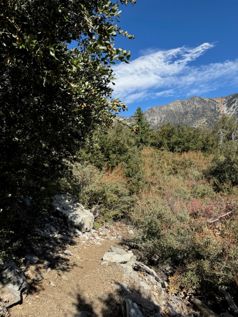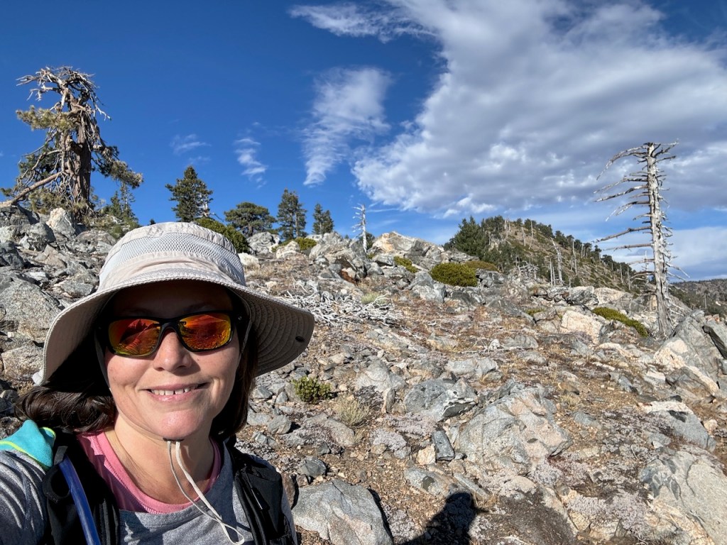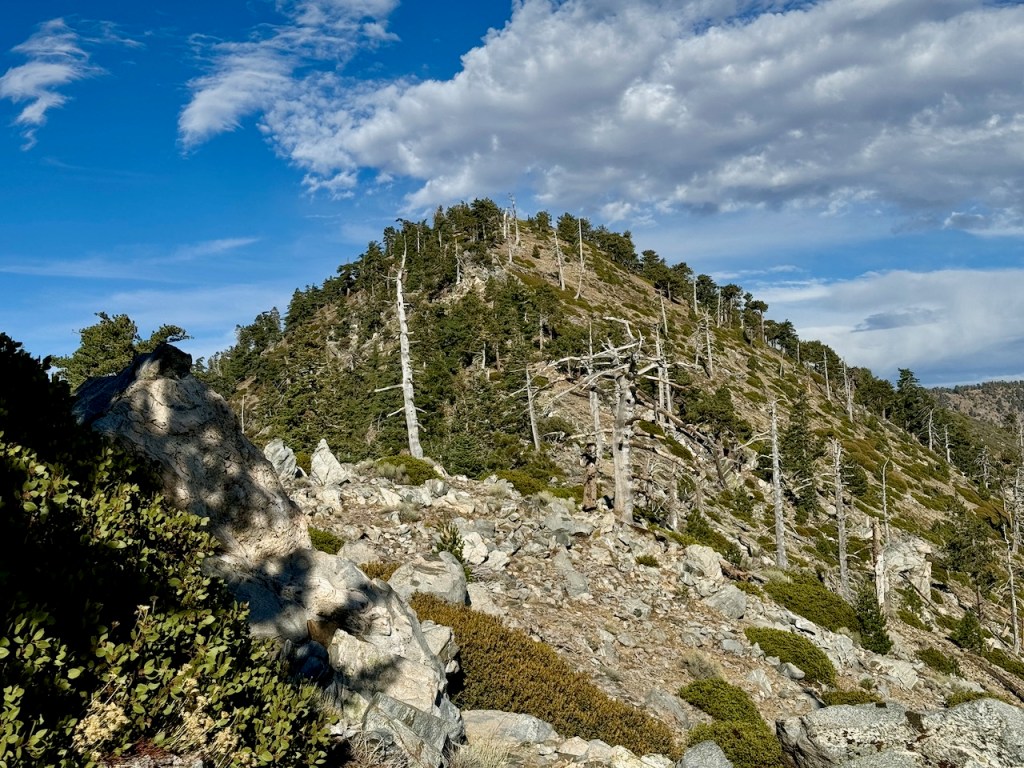 It was mostly exposed to the sun, and there were clear views of the opposite ridge of Middle, Sadie, and South Mount Hawkins. The ridge had a red tinge, from fire retardant, to hold back the Bridge fire, which charred the area east of Crystal Lake, raging for well over a month, growing to over 56,030 acres before containment.