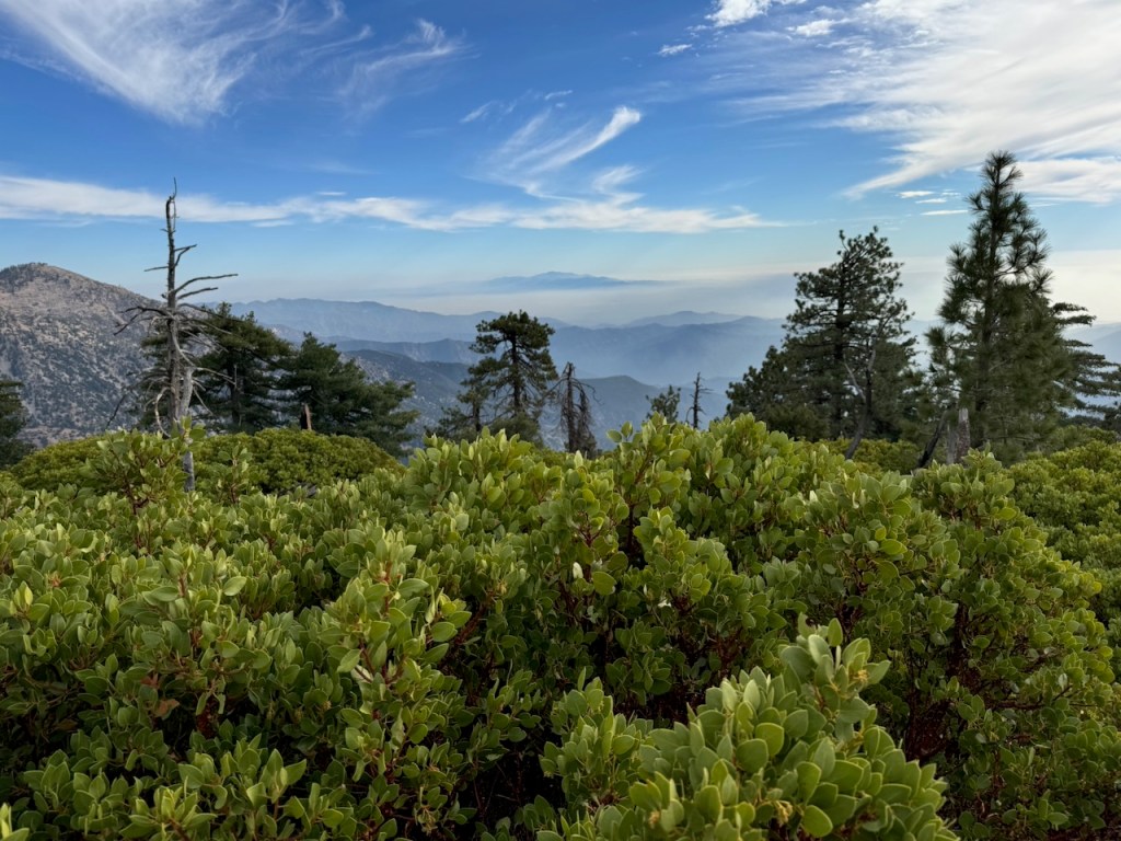 The hillsides were thick with low growing Manzanita along the saddle. Off in the distance, there was still smoke from recent fires lingering.
