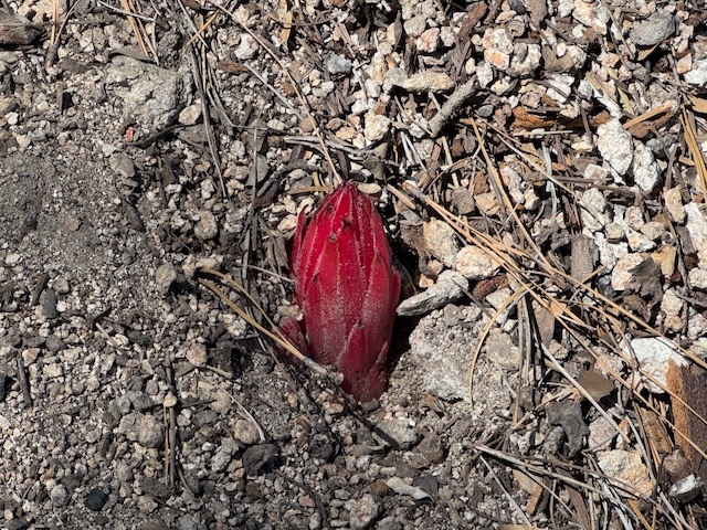 I noticed the red hue of the alpine snow plant poking out.