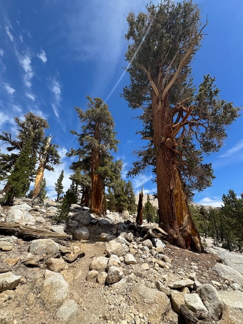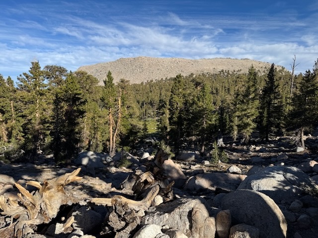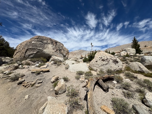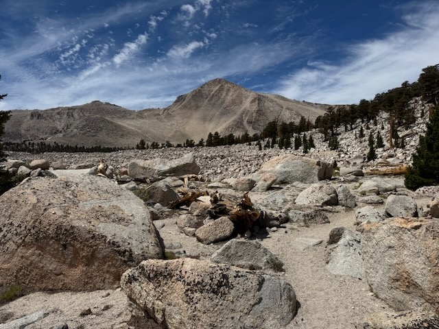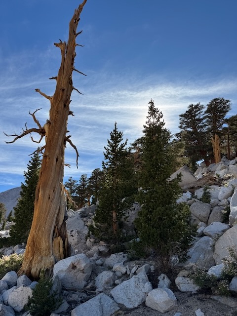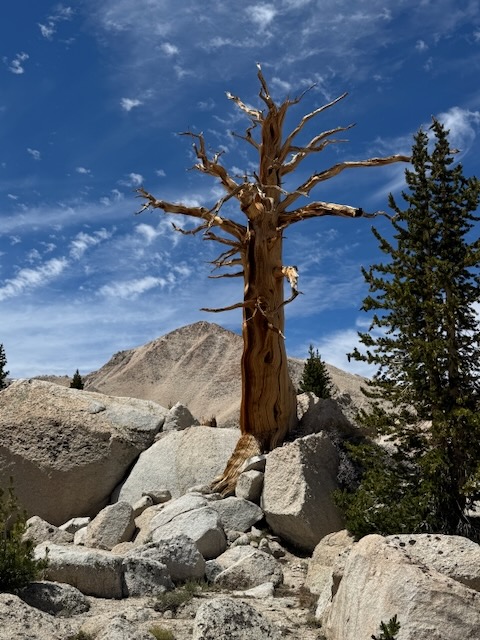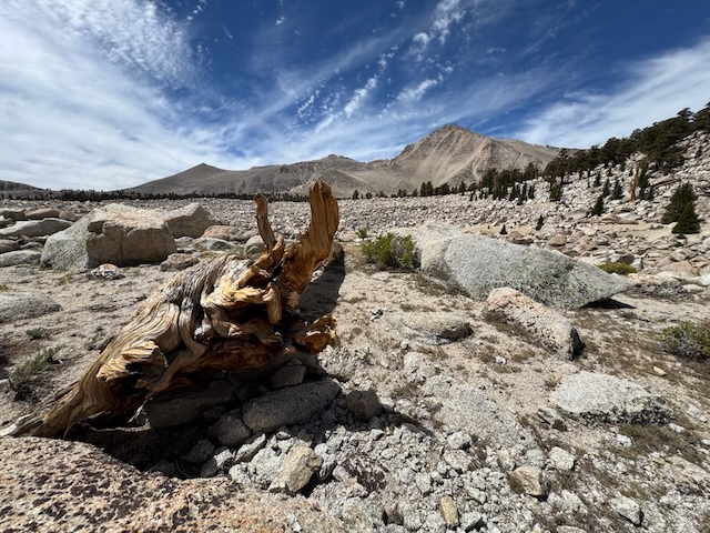 I passed Lake #1 and #2 and was bound for Long Lake, where I planned to fill up on water, and head up towards Mount Langley (still a glimmer of possibility). As I edged closer to the trail leading up to New Army Pass, I entered a field of boulders, and bare freestanding trees standing, looking more like sculptures than alive.
