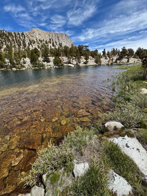 I hiked along the lake edging closer to New Army Pass, my destination for this hike. I knew the chances of summiting Mount Langley today were slim. I was already exhausted, yet I hiked on a bit further.