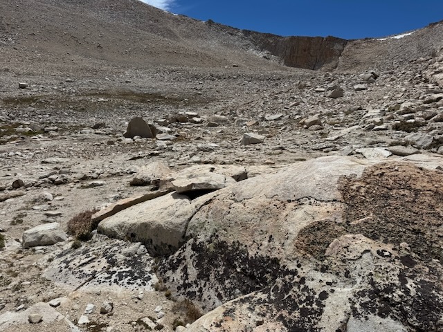 After a bit more climbing, I was fully within a towering granite bowl, reminiscent of when I visited Guitar Lake and summited Mt. Whitney via the High Sierra Trail, on the backside of Mt. Whitney.