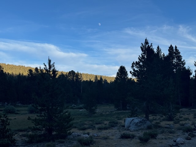The once sunny meadows were now moonlit, as sunlight had begun to fade, by around 6:30 pm. The last few miles included a true fight to stay in it. I felt completely miserable and was hiking in a daze the last 2.5 miles. My knees were hurting, and I felt unstable. I knew from how I felt and my slow speed, I had passed the point of exhaustion.