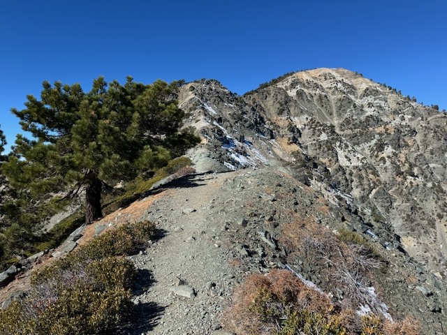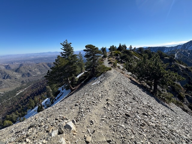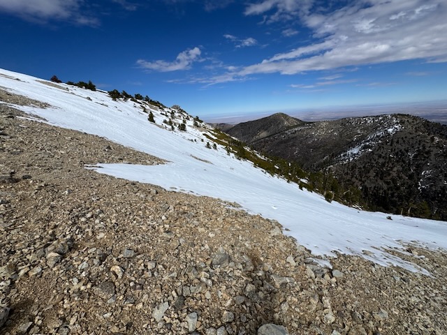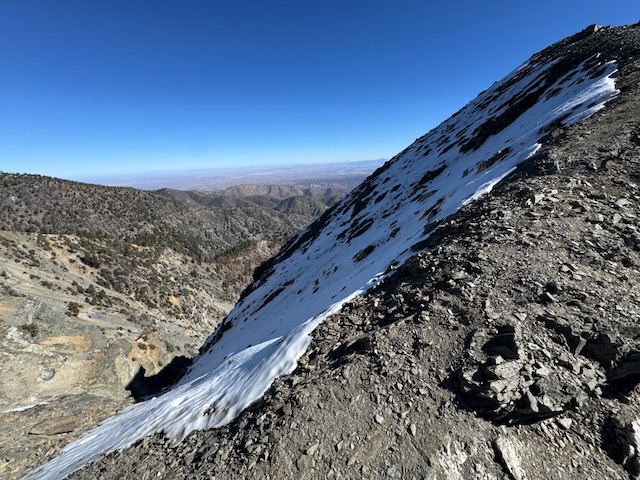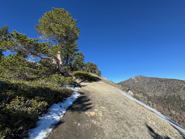 I began heading up Baldy Rd. towards the notch, since today I planned on summiting Mt Baldy via the Devil’s Backbone Trail. It had recently snowed here a week ago, and I had a feeling the snow had melted off along the trail just enough in the past few days, with the warmer drier conditions, to make the backbone trail safe and passable. But I still brought micro-spikes and a trekking pole for stability on small patches or snow or ice.