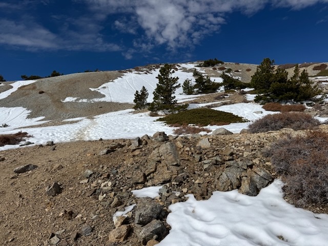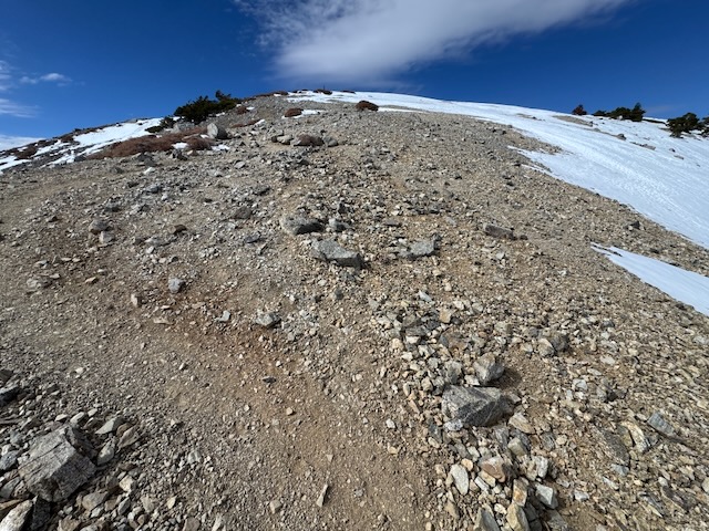 I made it to the backbone, and at least initially it seemed the snow had mostly melted off along the rocky spine, so I continued my climb.