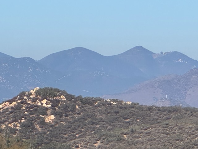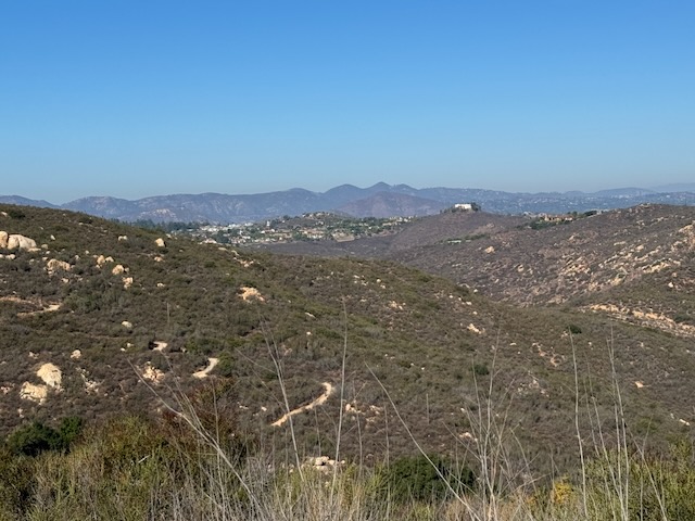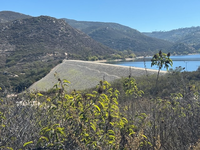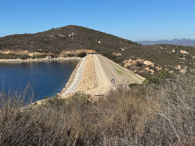 As I headed uphill I spotted the boulder strewn peaks surrounding Lake Ramona, with its dam section visible in the distance.