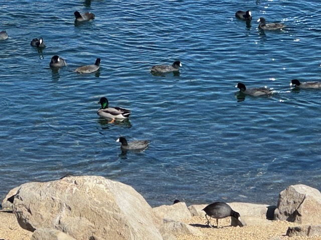 Beyond this was a boat launch and lots of migratory birds such as ducks and coots swimming, with a crowd gathered around them feeding them.