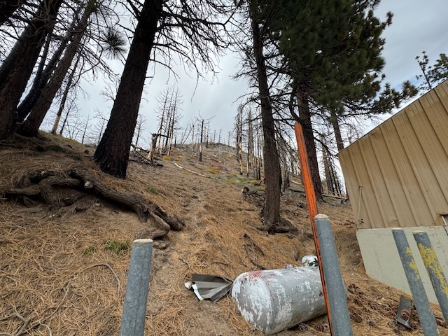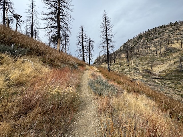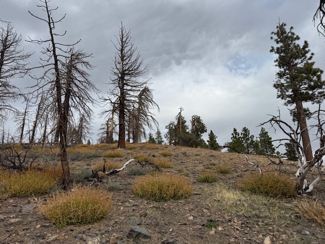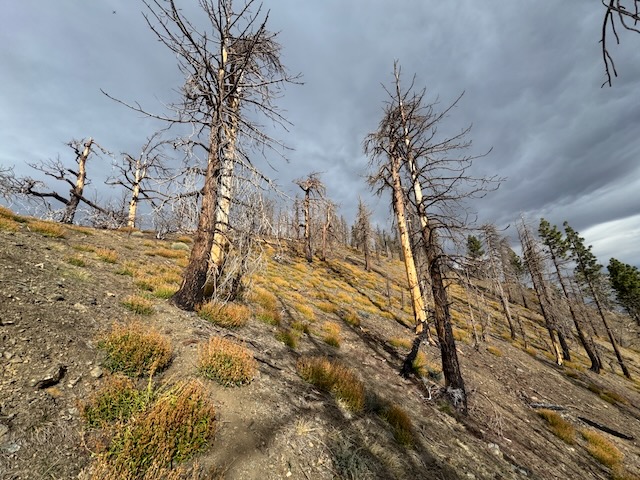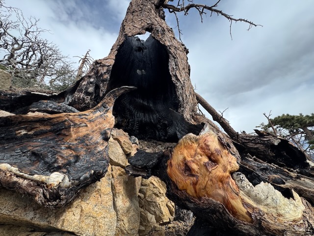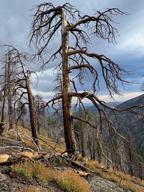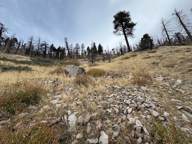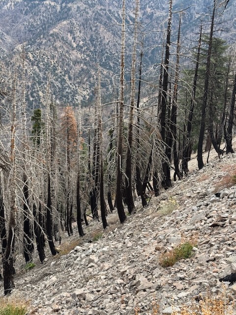 The trail eventually leads me over dynamic granite filled rockfalls, cascading down steeply pitched hillsides, leading toward charred trees resembling lit matchsticks.