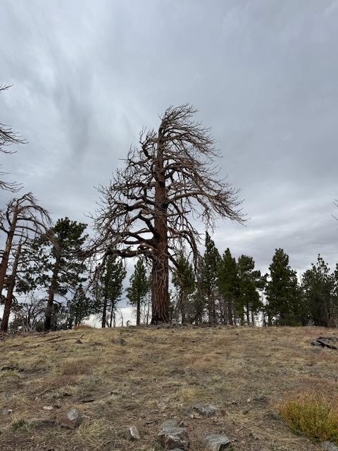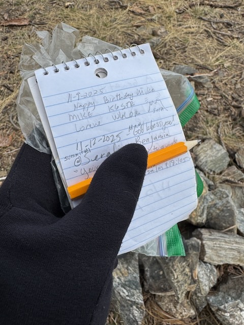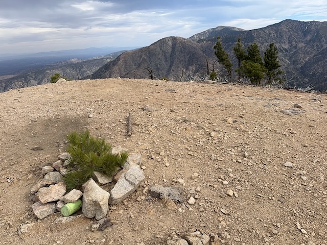 The peak has a large charred pine in the center, and next to it, I found the register. I noticed that the last hiker to sign this before me, was several days ago, indicating how infrequently this peak is visited.