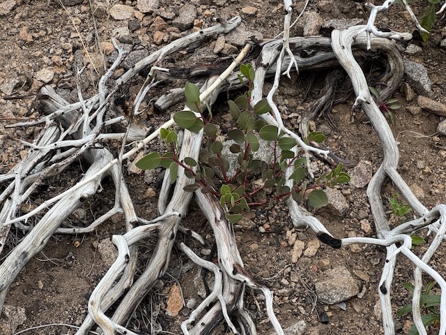 I see the evidence of nature renewing itself all around. Resembling the arms of an outstretched skeleton, the remains of mature manzanita cover the hillside., victims of fire. Yet, from all this, new seedlings emerge.