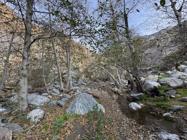 Off to my right was the steep charred hillsides, and to my left the San Gabriel River, fresh green grass and trees, standing in sharp contrast to one another. I hiked through grassy meadows, dotted in fall leaves. What would I find? I truly felt alone here and isolated, and another worry was running into strange creatures or folk. This felt like an off trail excursion. I trod on, in hopes there was a beautiful picturesque waterfall waiting.