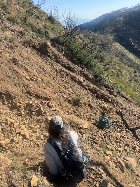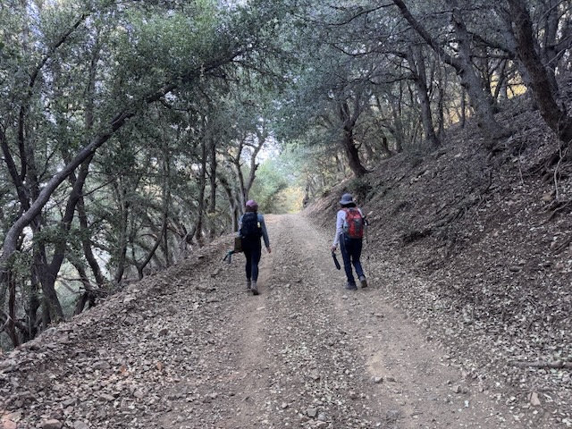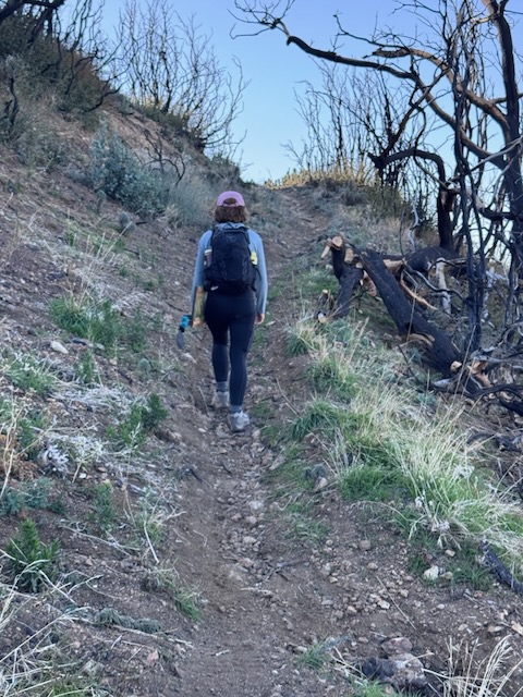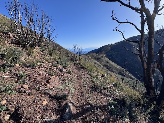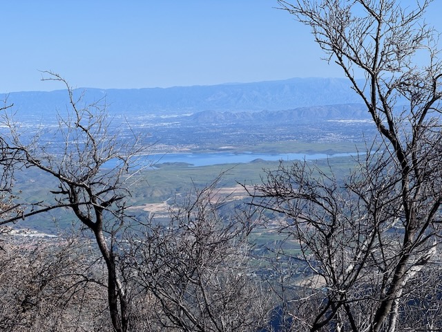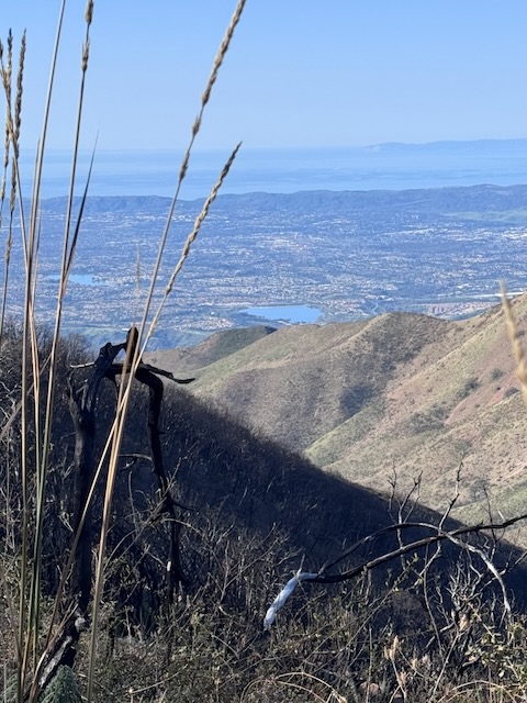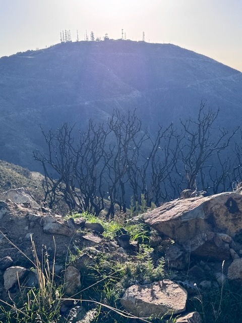 We began hiking from a staging area on the ridge, by the marker which reads “5S04” toward the first peak, Modjeska Peak. At first the hike was along the North Main Divide Rd. Soon, we entered a narrow steep trail to the left, and began the climb, through recently charred underbrush and trees, a scar left by the Airport Fire.