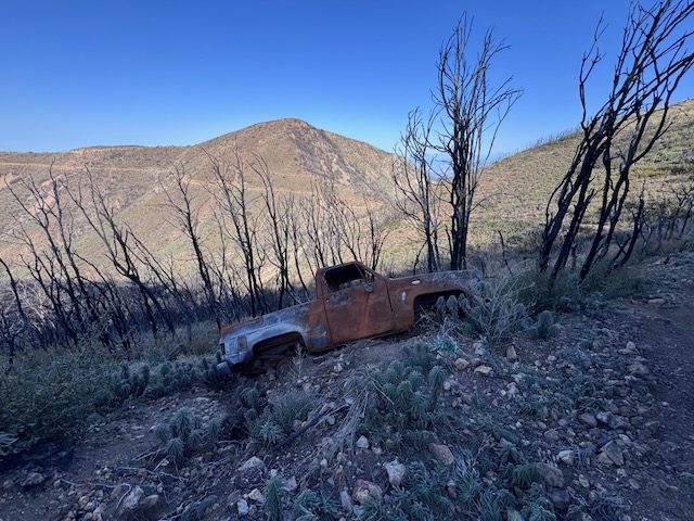 Passed this car wreck, framed by Modjeska Peak in the distance behind it.